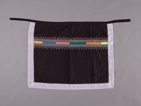 本件腰裙係以黑色布料為底,為長方形之單片式長裙樣式。正面左、右兩側及下襬共三邊貼縫長條形白色紗布,裙面上緣則接縫細長黑色布條,此布條長逾裙面寬度,多餘長度作為綁帶使用。在此件裙身內緣中上方施以紋樣,係以米黃、藍、粉紅、綠、橘、鮮黃等色之毛線繡出橫條形紋,此紋路圖案上、下以方形、菱形及相連三角形紋刺繡圖案作為裝飾,繡線較細,色彩為綠、紅、白、粉紅、藍、黃等色。