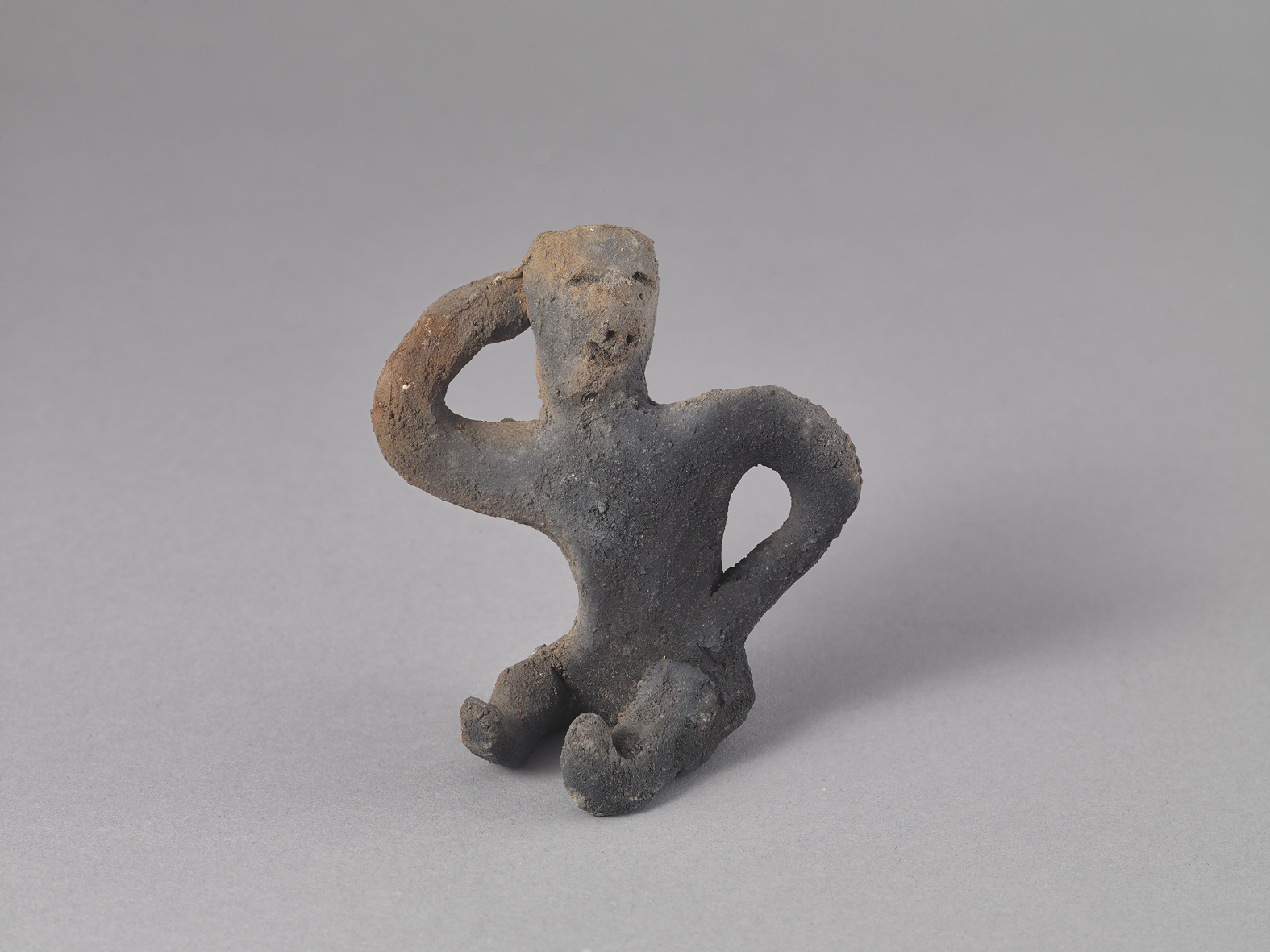 本件陶偶為陶土捏塑燒製而成,人偶採坐姿,雙腳一長一短,右手置於後腦勺,左手插腰,腰部微轉,臉部表情愉悅,整體手法簡單卻富饒趣味。陶偶長5cm、寬5cm、高7.5cm。
