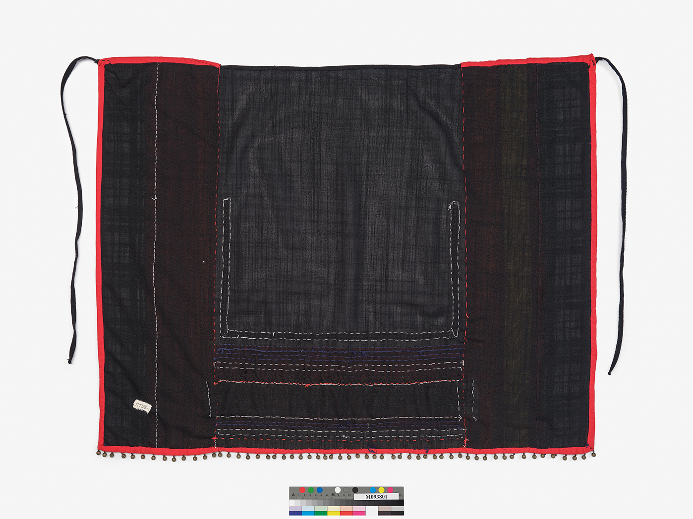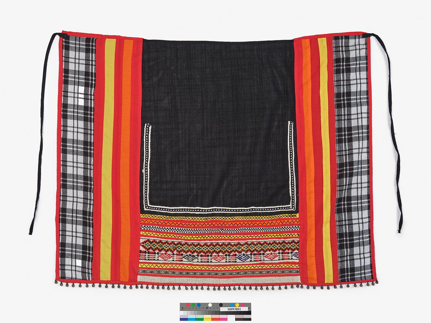 此兩件大小、形制相同,唯織繡圖案有別之女子長裙組,分別以方形的黑色棉布為底,並在裙子左、右兩側邊以貼縫技法對稱貼縫紅、橙、黃三色細長棉布條及黑、白、灰三色方格紋印花布,並以紅布緄邊。中央黑色棉布貼縫凹字型繡帶,裙子中下方貼縫彩色織繡布片,有菱形、曲折形、方形等橫向圖案。整件長裙左、右上方兩角各縫接一條黑色棉布綁帶。此外,館藏編號M093801下襬處另有縫綴一排銅鈴。