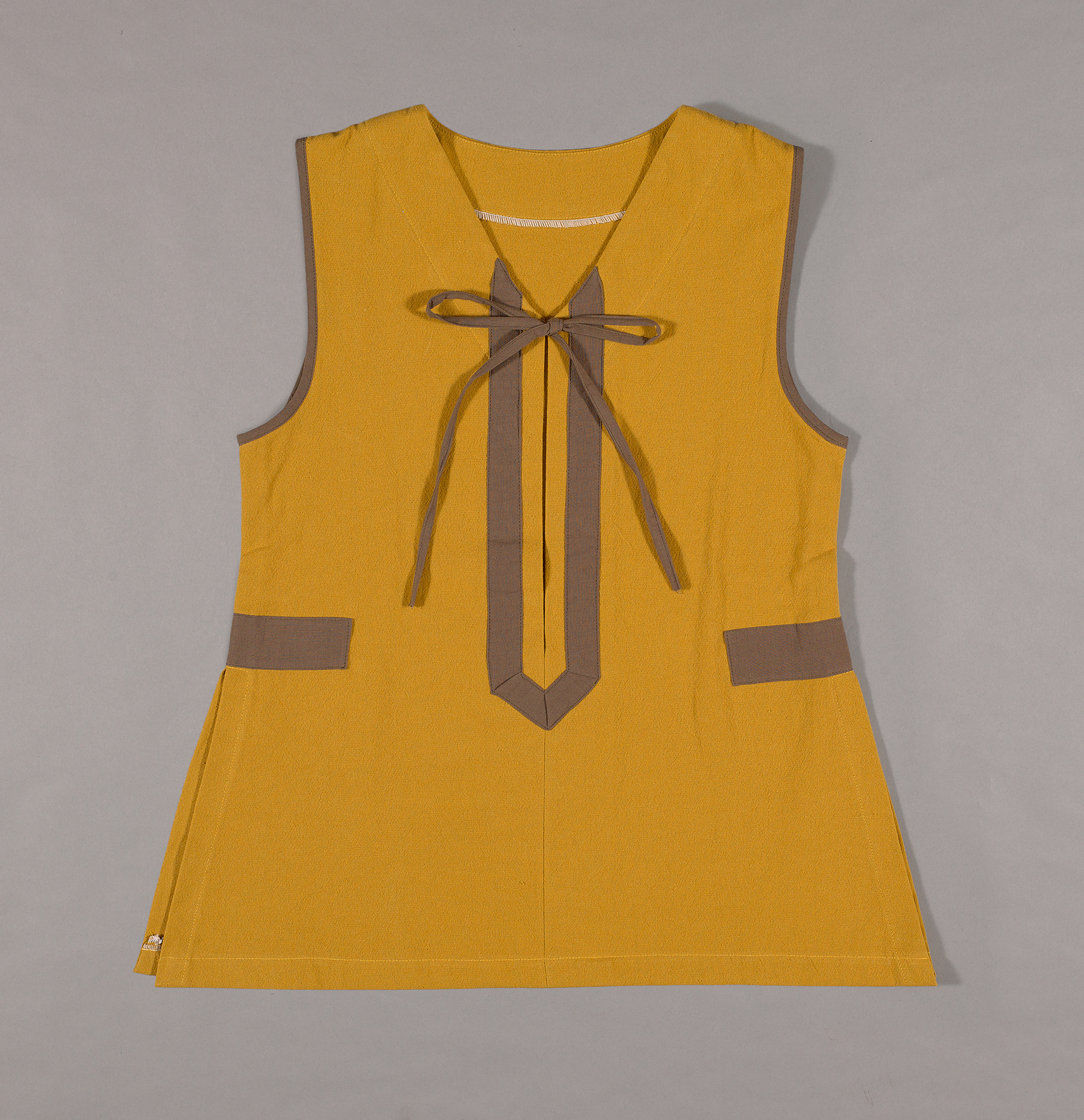 本件服飾係以黃色布料剪裁縫製並再貼縫棕色布條而製成的無袖背心。衣身左、右兩側約在腰部以下開岔,兩袖圈以棕色布條緄邊,再以同款棕色布片貼縫衣身兩側開岔處上方。領口為V領,前襟處於腰部以下縫合,前襟處以劍形貼縫棕色布條,再將一對棕色布條接縫領口上使之成為綁帶。