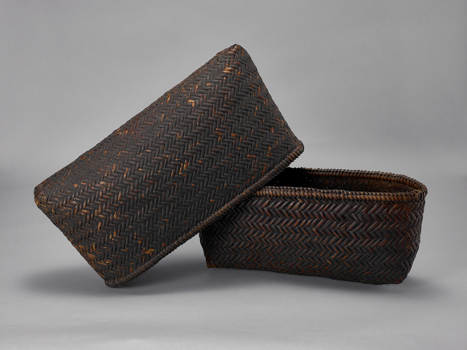 此為一件竹/籐編盒,色澤呈深褐色,共分兩部分,分別為下方的籃身及上方蓋子,兩件形制相同皆略為橫長樣式,籃蓋尺寸略大於下方之籃身。製作方式係以竹篾圈成長橢圓形以固定籃口形狀,籃身及籃蓋皆由籐篾採斜紋編法編織而成,籃口則以8字形辮狀編法修飾口緣。