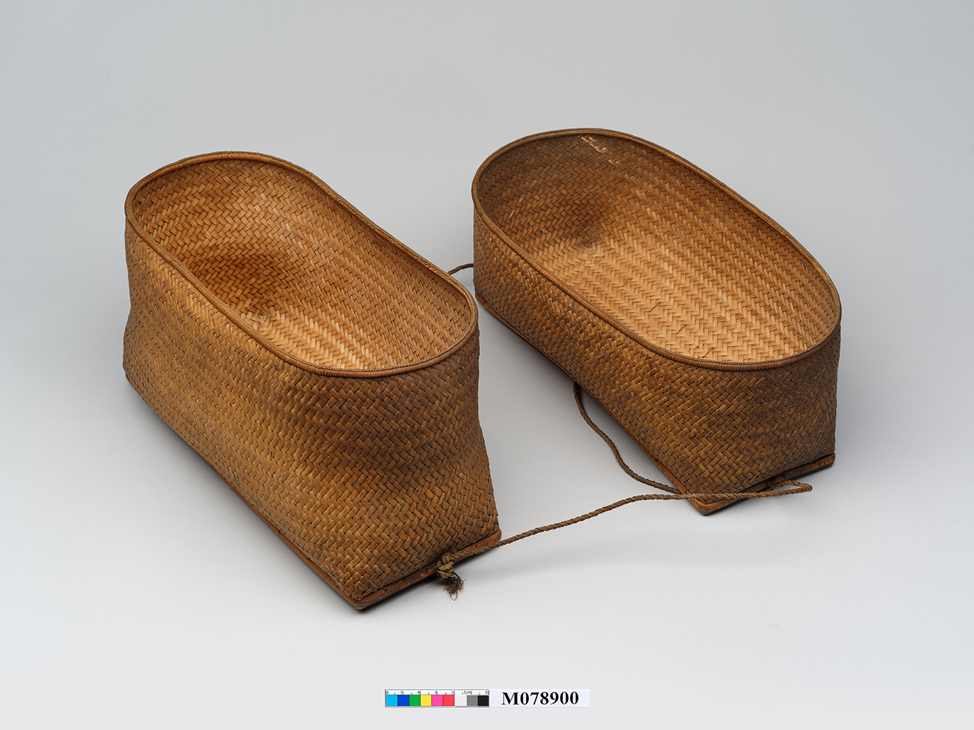 本件為中型籐編籃且有提繩之設置,可於外出工作或狩獵時攜帶,放置食物作為便當盒,亦可固定放置於屋內做為儲物容器。