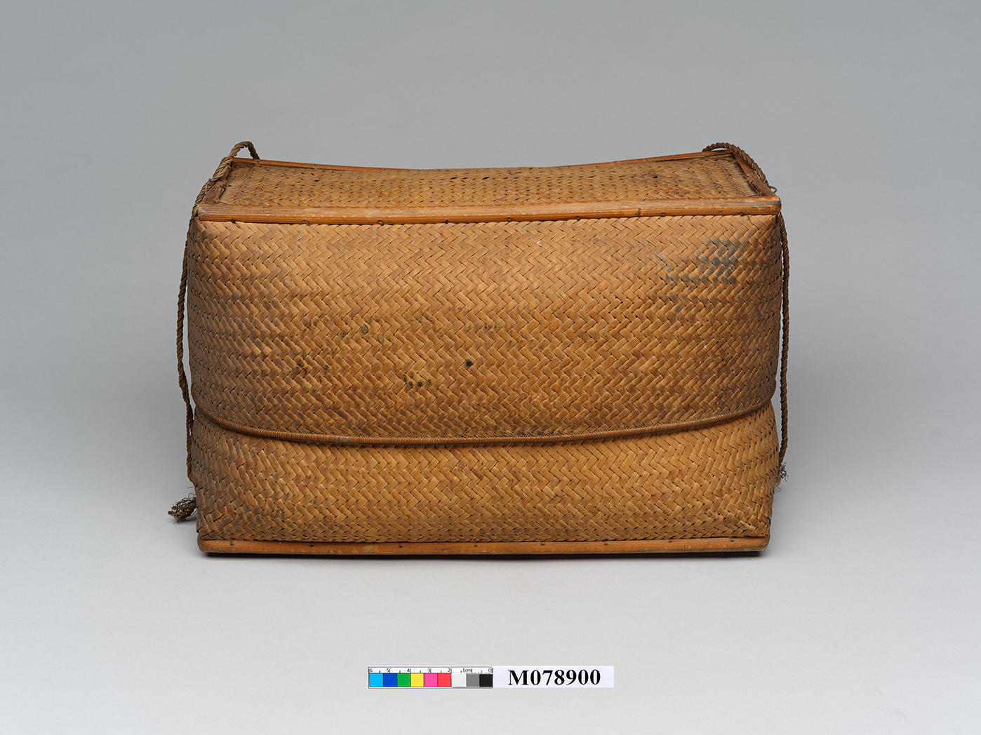 此為一件籐編籃,色澤呈褐色,全件可分成上、下兩部分:下方的籃身及上方的籃蓋,兩部分形制相同皆為橫長樣式,惟蓋的尺寸略大於下方之籃身。製作方式係以籐條圈成長橢圓形以固定籃口形狀,籃底以粗籐條框成長方形,籃主體皆以籐篾採斜紋編法編織而成,其編法係將每一個籐篾間隔一條或以上的距離,並與其垂直的籐篾交編,相鄰的平行籐篾與其垂直籐篾交織僅隔一條之差,因而形成斜紋。籃口則以8字型編邊法修飾邊緣,係將邊緣的編條作8字型捲紮或編織成器緣。1另以一條粗麻繩做為提繩,穿入籃身及籃蓋底部兩側短邊之籐圈。