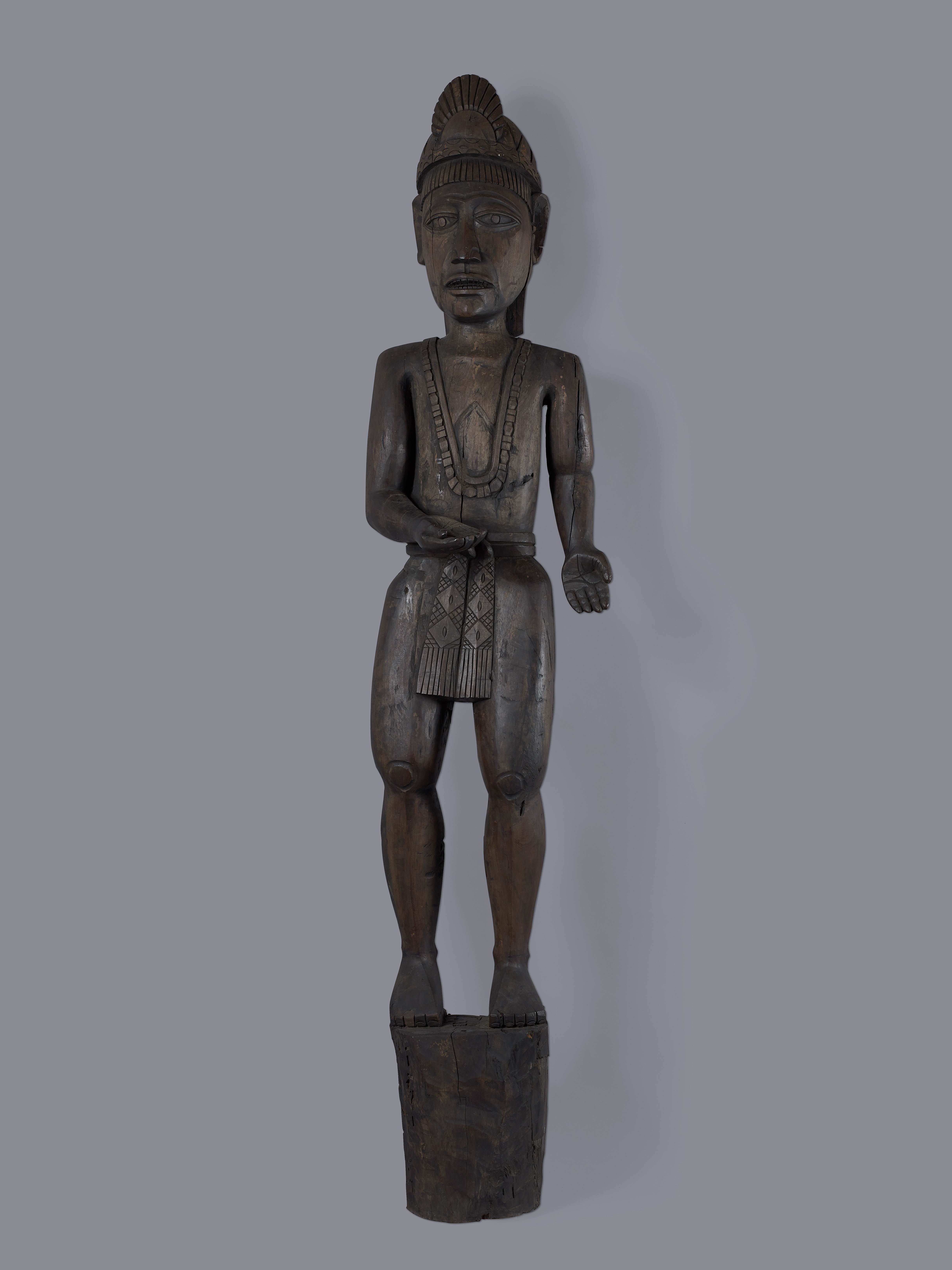 本件作品高210公分,屬於大型雕刻品。排灣族傳統上為紀念先祖所雕刻的人像較多平面浮雕形式,姿勢也較為制式,人像刻劃較為抽象。本件除了較為寫實、立體以外,表現也較為生動活潑,可能為日治時期或之後受外來影響所發展出來的寫實風格雕刻。