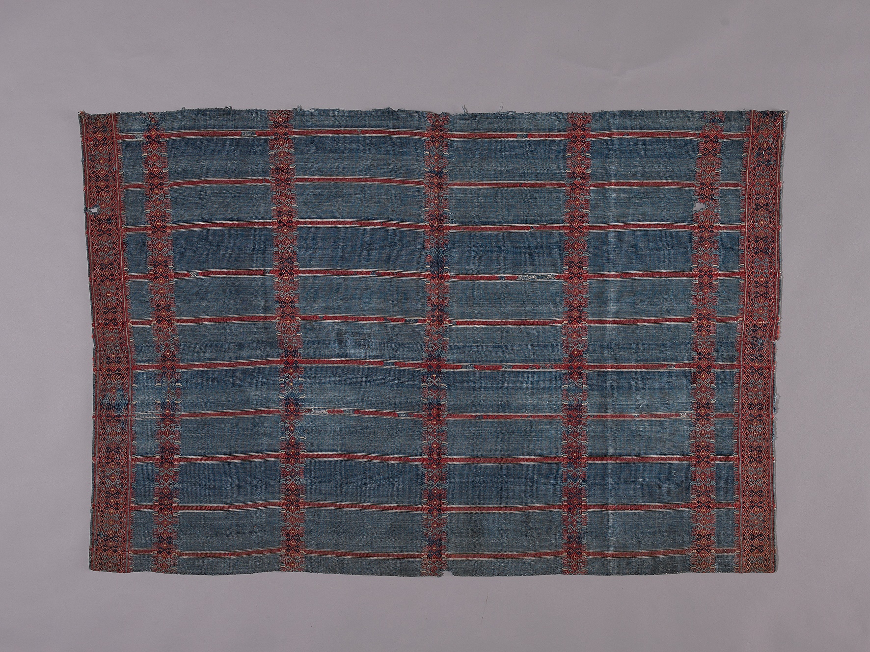 本件藏品為排灣族喪服,係由兩片織紋相同、大小相近之長方形麻織布於長邊相縫合而成,且一長邊留有剪裁痕跡。全件以藏青色麻布為底,布面上織有紅、藍、黑、黃、白等色毛線,織紋圖案元素有直條形紋、橫條形紋、小三角形紋、小菱形紋、交叉雙首蛇形紋及髮狀紋。織紋圖案的安排,左、右兩側為內含交叉雙首蛇形紋的直條形紋,內側邊緣為髮狀紋,小三角形紋和小菱形紋則為裝飾圖案。布面中央織有五道同樣帶有髮狀紋的縱向交叉雙首蛇形紋以及十道橫線形紋,使整件織布呈現長方格狀的樣式。