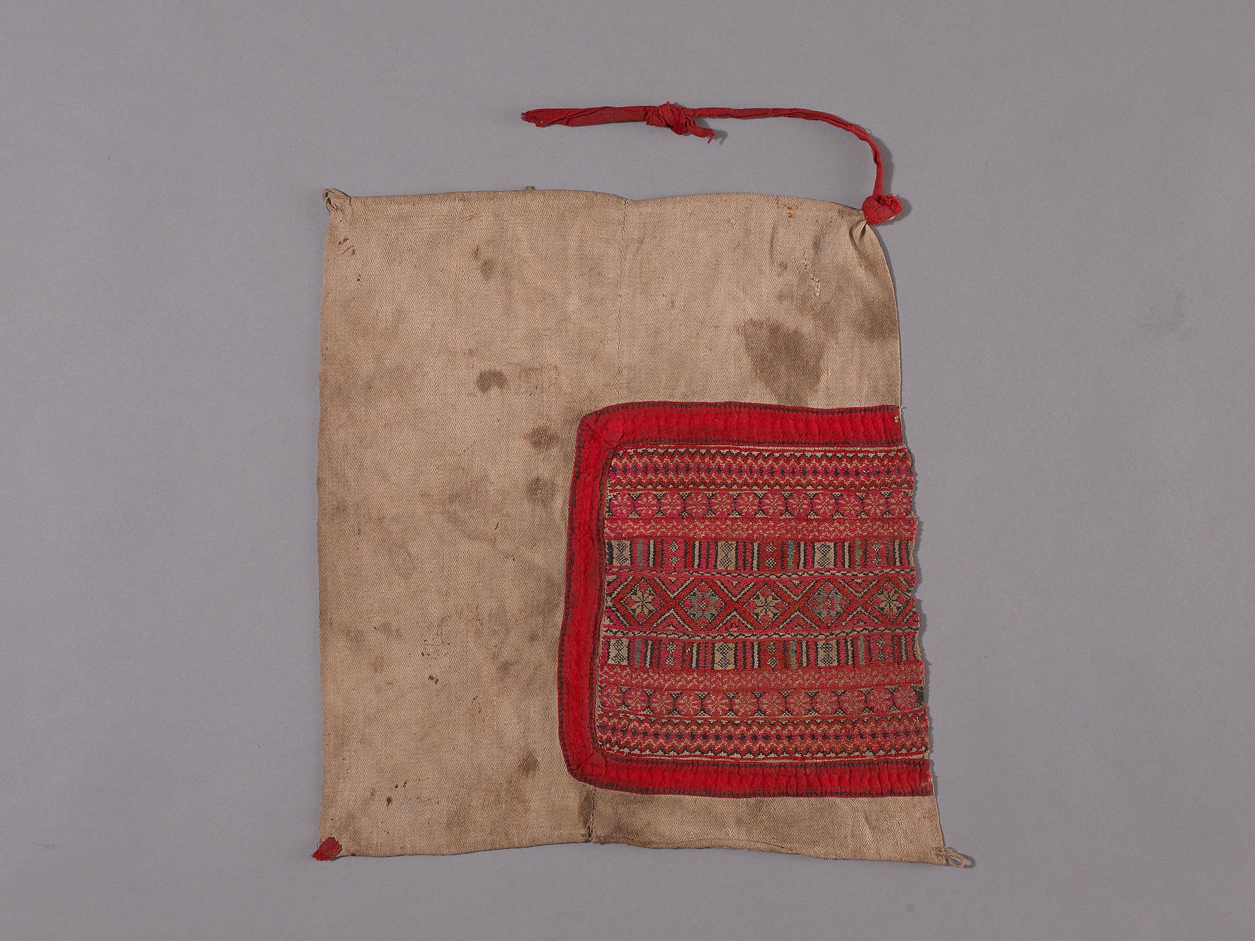 此胸布穿戴時需先將棉布綁帶與麻布套環兩兩相繫,再將胸布從對角處折成三角形,將左手套入左邊的綁帶並將頭部套入穿戴至左上身,右半邊亦同,綁帶在身後呈交叉狀,胸布即在胸前呈三角袋形,可以放置一些小物件。因此,胸布除了服飾功能外,還具實用性,本件族語稱為kuling,亦為口袋之意。