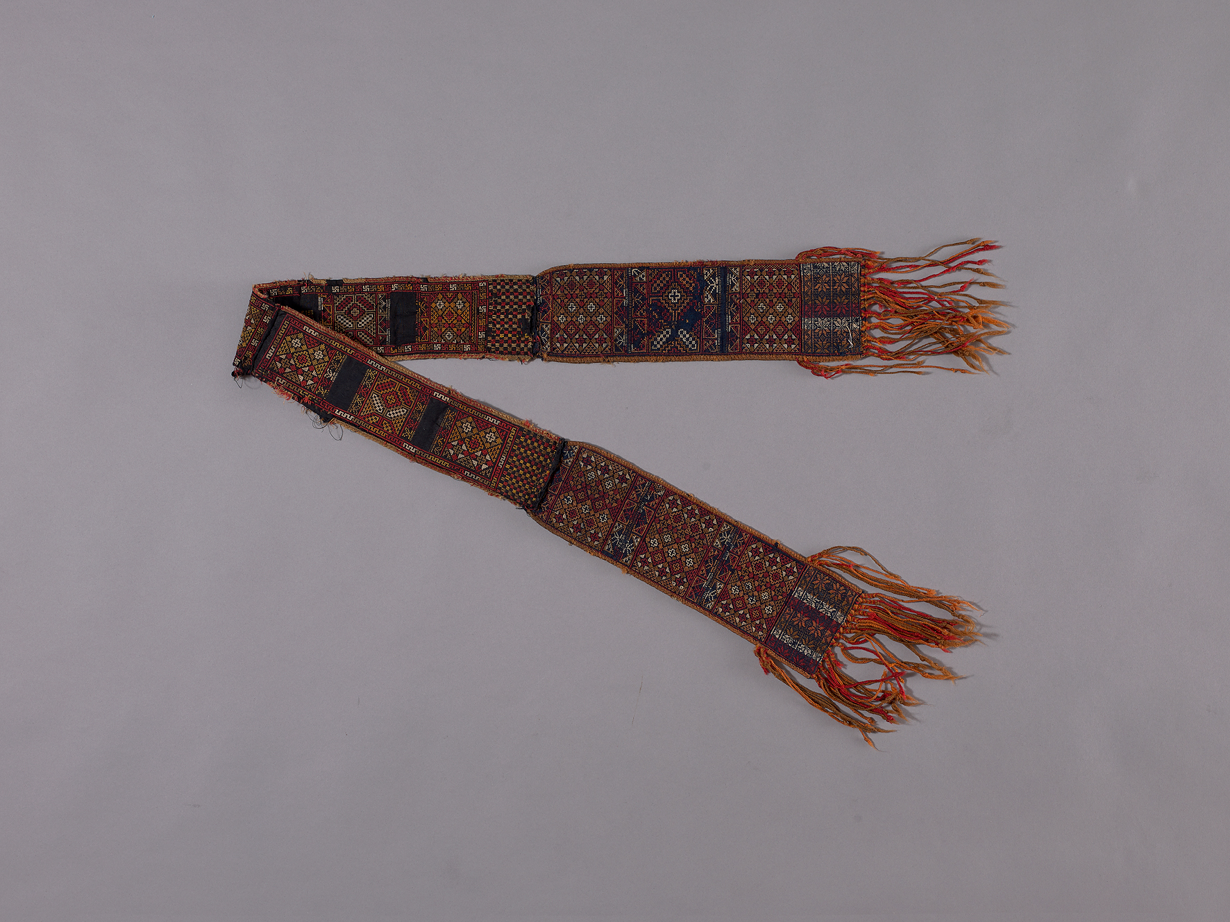本件雖無法確定族群歸屬,但此種細長布帶於服飾穿著時,一般做為腰帶以防止衣物滑脫或是做為額帶保護頭部使用。