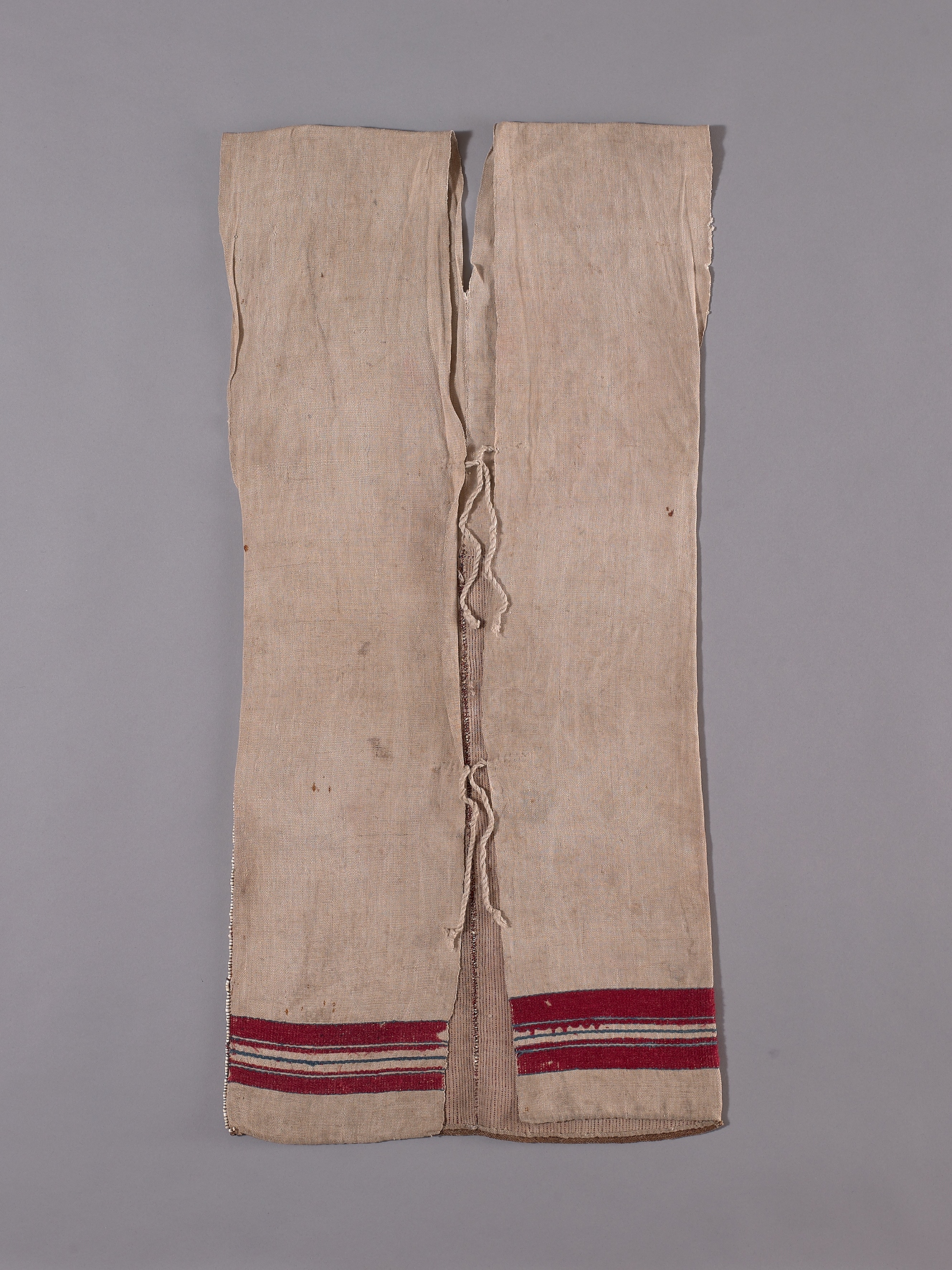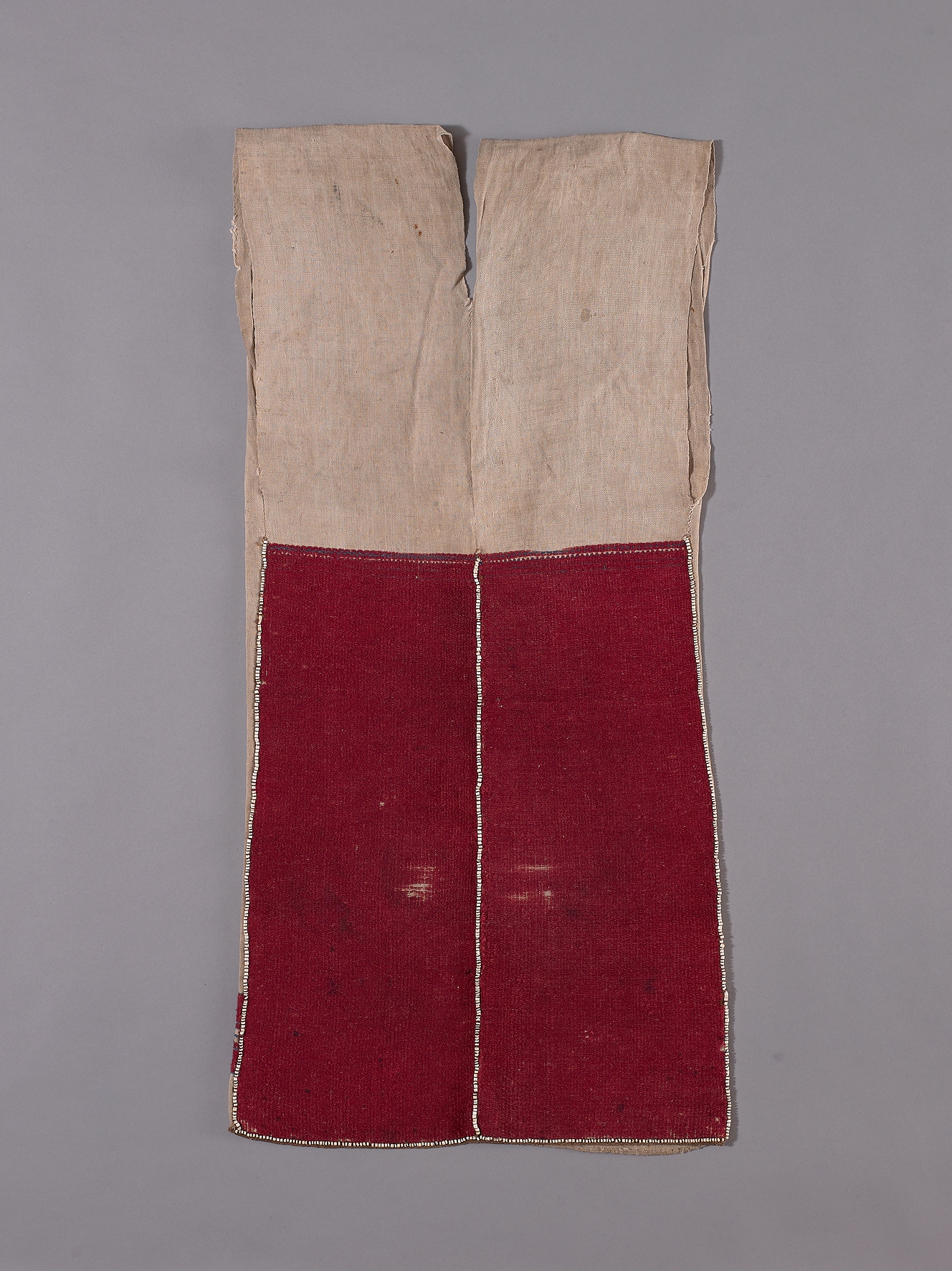 本件服飾係由兩片大小相等且未經剪裁的長方形織布縫合而成,製作方式係先將兩片布片於長邊對齊,由下往上縫合至靠近中線處,再將未縫合部分向前摺成為前襟,縫合面則為衣服背面。衣身兩側邊由下往上縫合至三分之二高度左右,為縫合處做為袖圈,本件服飾形成一件無領無袖之對襟長上衣,為臺灣原住民族傳統的方衣形制,前襟處縫有兩對麻繩綁帶。本件服飾以苧麻為經線,紅、藏青兩色線為緯線夾織橫向織紋,正面施於下襬處附近,衣身背面則是從約二分之一高處向下施以整片紅色紋樣並在織紋左、右、下方及中央縫線縫綴貝珠串。