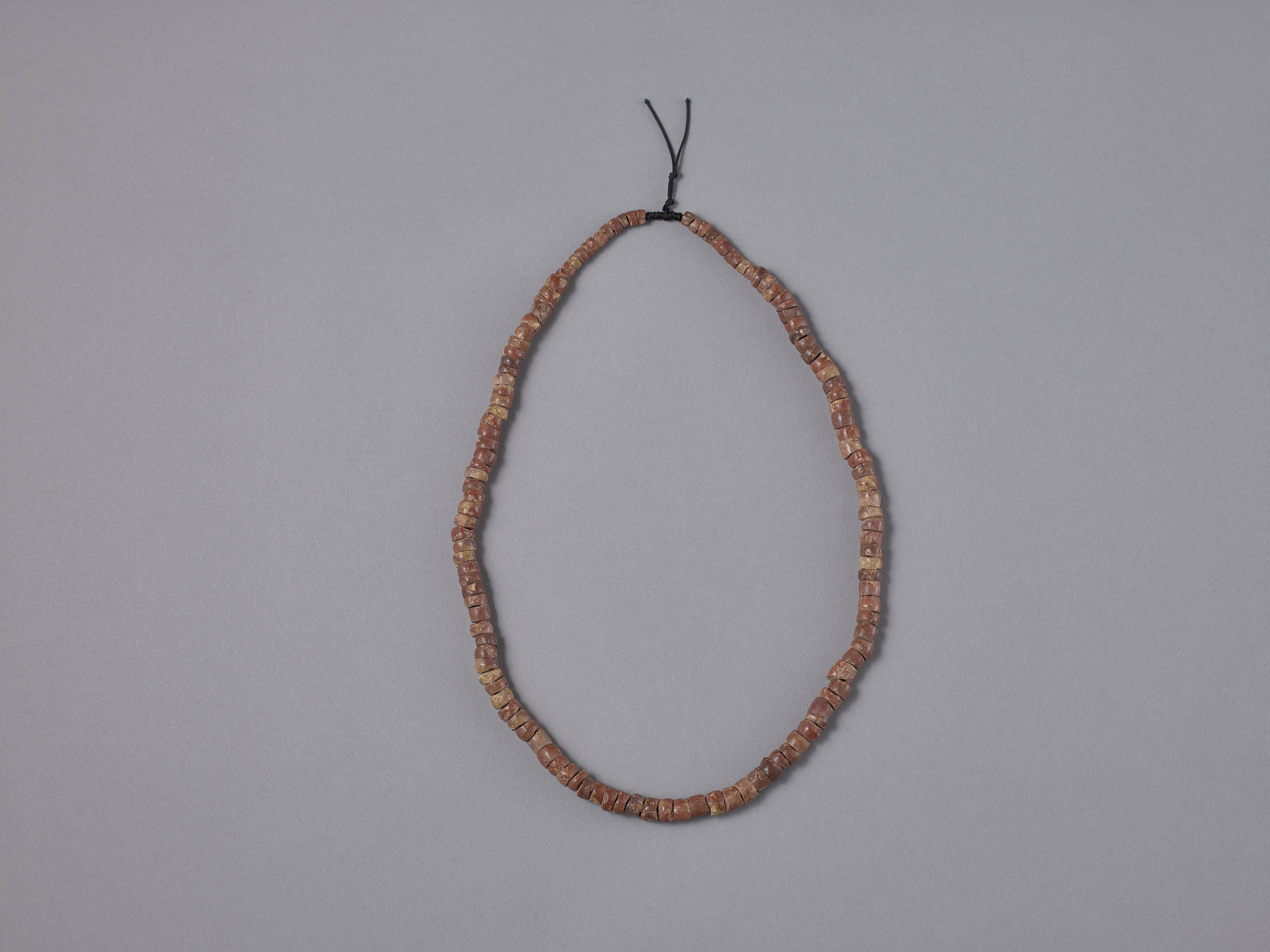 本件琉璃珠飾係以黑色棉繩串起126顆琉璃珠組成,總長約68.9公分。本件琉璃珠尺寸大致屬於中小型的琉璃珠,為不工整的扁圓柱狀,多為褐色,少數幾顆為土黃色,整體顏色相近且風格樸拙。穿串琉璃珠的棉繩末端纏繞後分別打了兩個結。本件琉璃珠外觀均有些許磨損痕跡或凹洞、破損,略顯斑駁。