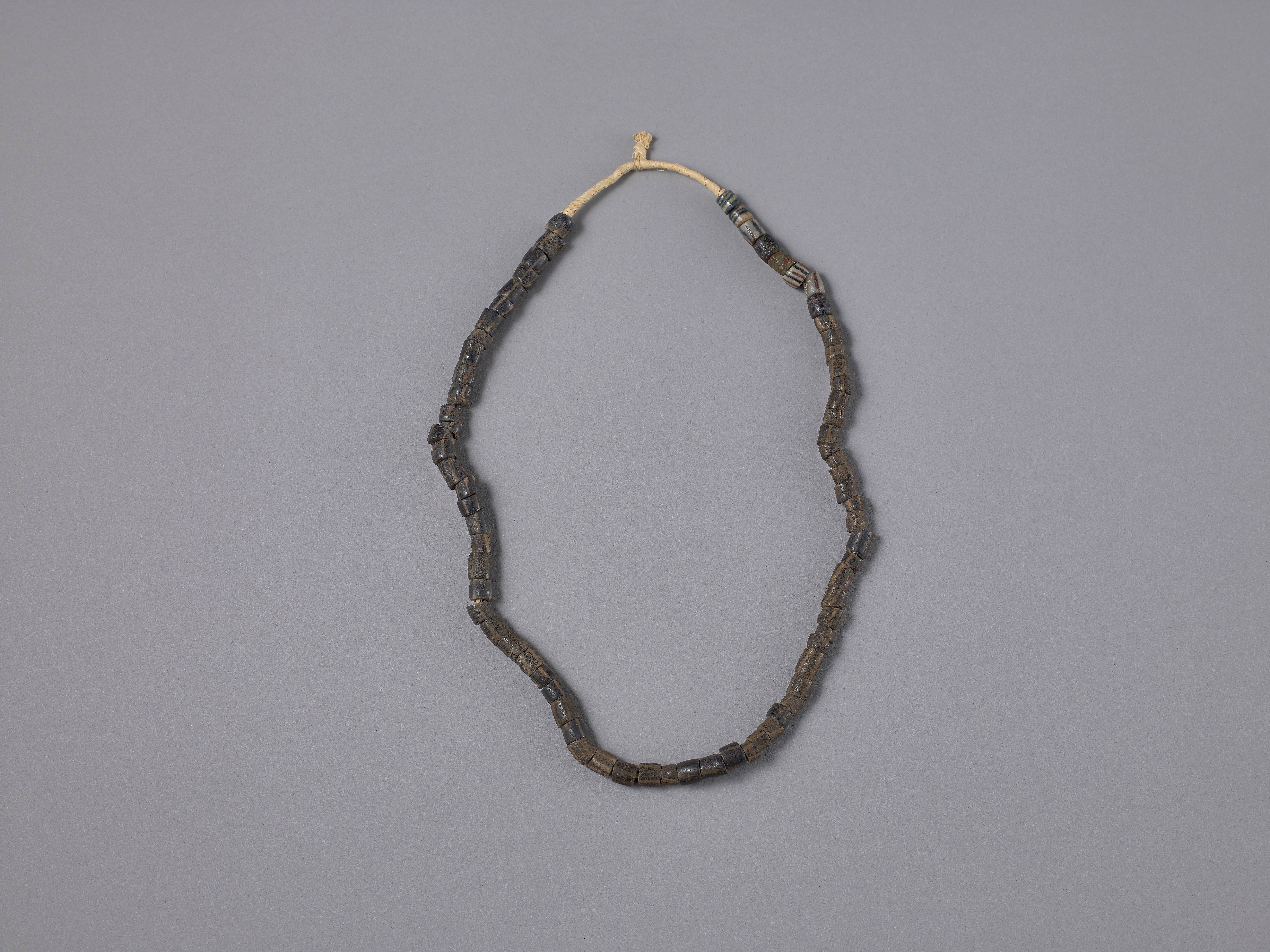 本件琉璃珠飾係以米白色麻繩串起74顆琉璃珠組成,總長約68.5公分。本件琉璃珠尺寸大致屬於中型(約0.5~1公分)的琉璃珠,為不工整的圓柱狀,紋樣多係以褐及黑灰等顏色交替構成之直紋,僅有數顆琉璃珠是白底上有褐色和黑色線條點綴,整體顏色相近。穿串琉璃珠的麻繩兩端以細草繩纏繞後一併繫結,防止麻繩磨損外,亦能固定琉璃珠不致移動。本件琉璃珠外觀多有些許磨損痕跡或凹洞。