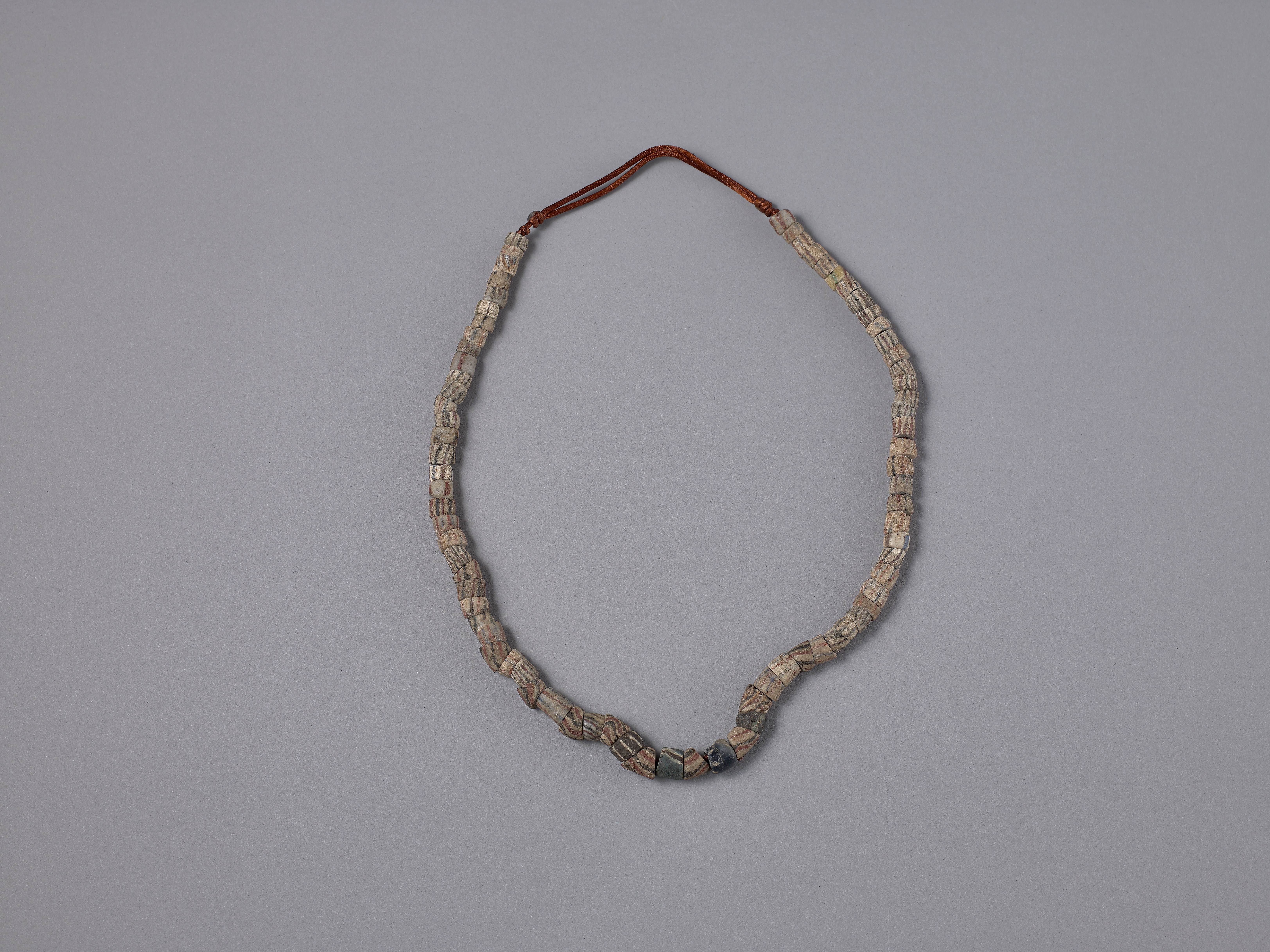 本件係由一條紅棕色尼龍編繩串穿琉璃珠而成之單串琉璃珠胸飾/項鍊。全件使用之琉璃珠皆為中型彩繪珠,每顆皆呈短圓柱狀形制,長度不一,共計有77顆。彩繪珠之紋樣圖案大多相同,多以白色為底,繪有數道紅、藍兩色縱向線條紋。僅有少數幾顆以深綠、深藍色為底,並繪有紅、白線條紋。