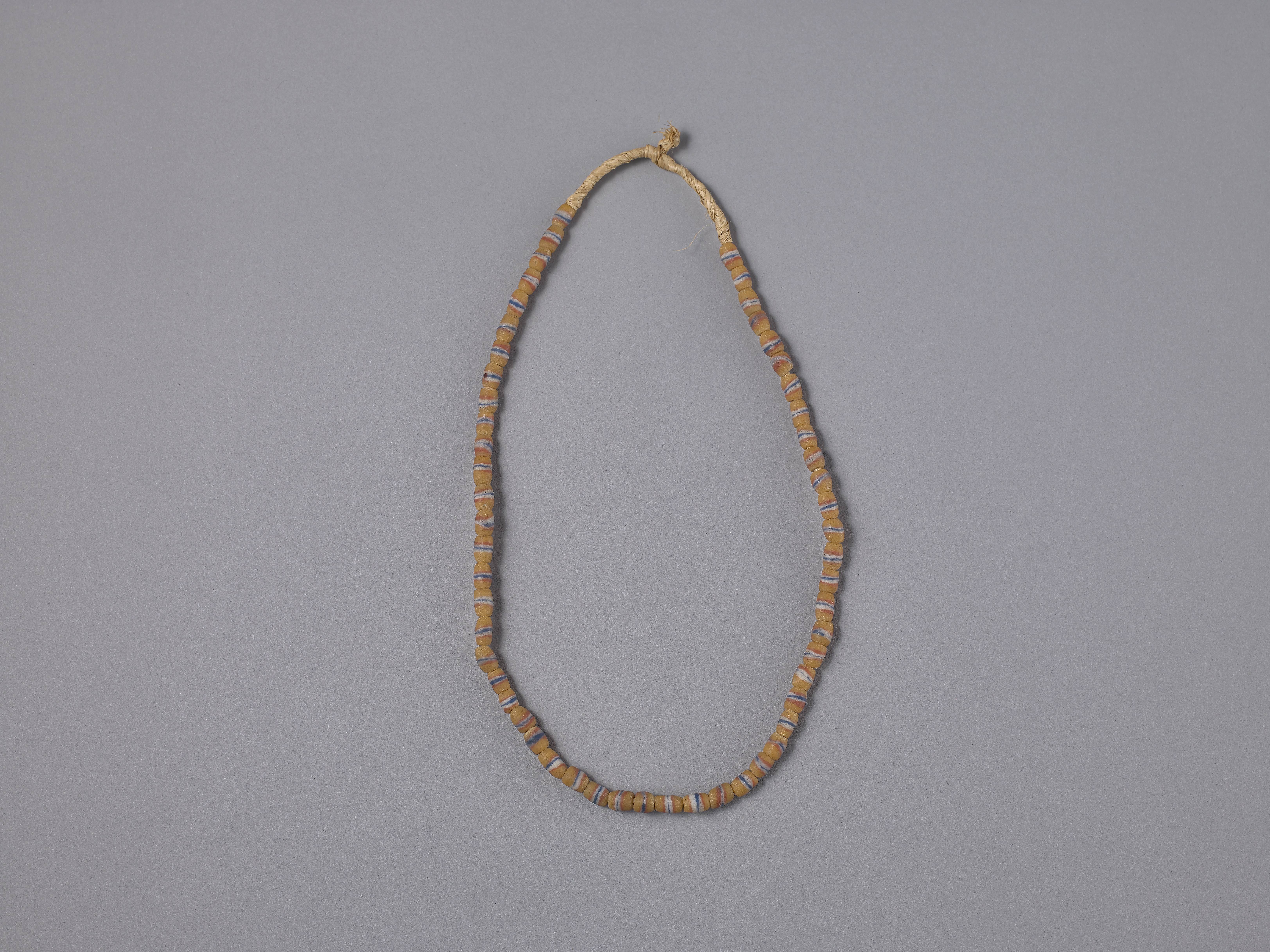 本件係由一條淺黃色草繩串穿琉璃珠而成之單串琉璃珠胸飾/項鍊。全件使用之琉璃珠皆為中型彩繪珠,每顆皆呈圓柱狀形制,長短及大小不一,共計有55顆。每顆珠子彩繪紋樣圖案相近,以橘黃色為底,中央繪有一道紅、藍、白三色之橫向或斜向線條紋。