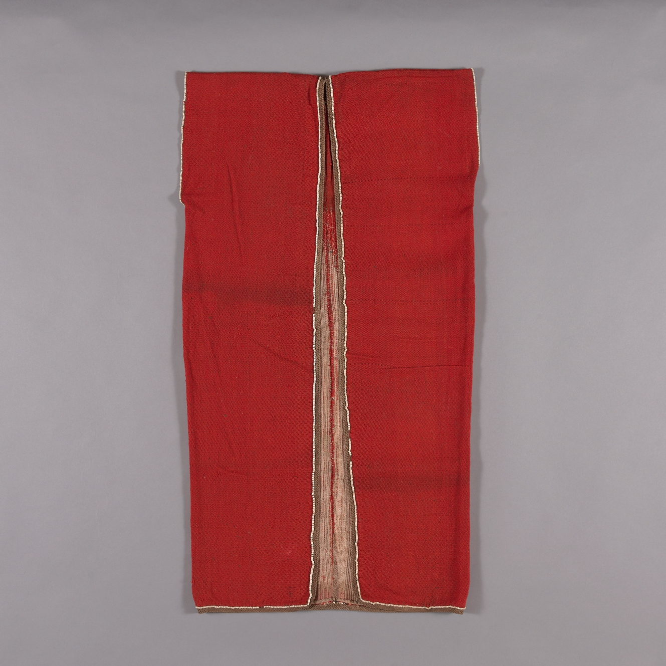 本件服飾係由兩片未經剪裁的長方形麻織布於長邊對齊並縫合至中線,將未縫合的部分向前折作前襟,再於衣身兩側從腋下處向下縫合成為一件無袖、無領、無釦、前開對襟之服裝,為臺灣原住民族傳統的方衣形制。衣身邊緣以麻線編帶緄邊,在前襟兩側、下襬、側邊及背面中央縫線處,縫接一條貝珠串為飾。此件長衣以原色麻線為經線,夾織與浮織紅色羊毛線。長衣正面全紅並延伸至後背處,後背至下襬為另一組橫向織紋,並在背面幾處織有短橫線紋及兩兩一組之菱形紋樣。