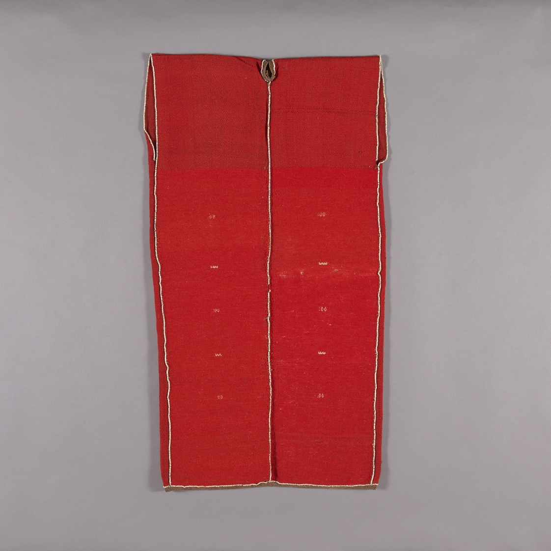 泰雅族的服飾保留了較多傳統的方衣系統,同時服飾上大量使用紅色也是該族的特色之一。在泰雅族的傳統信仰中認為鬼靈(rutux)最怕紅色,所以將衣服染紅即有嚇鬼的作用,因此後來多採用紅毛線夾織衣服。至於白色的貝珠雖見於泰雅、太魯閣及賽德克等族的服飾,但是作為原料的貝珠卻非上述各族群自行生產,而是與漢族、阿美、噶瑪蘭等族之交易品。從秦貞廉1803年所著之《漂流臺灣秀姑巒之記》,可得知貝珠由阿美族婦女製作並與泰雅族人交換的過程。本件雖僅有少數菱形紋,但菱形在泰雅族的文化意義為「眼睛」或「祖靈之眼」,具有守護和警惕之意,且樣式、色彩及技法多樣。