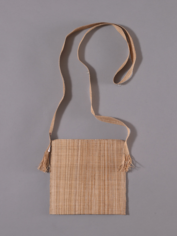 情人袋又稱為背袋、攜物袋及檳榔袋。本件全以香蕉纖維為主材質編織而成,袋身剪裁為長方形並對摺成方形兩層口袋形制。袋身背後左、右對摺兩角接縫黑布花草紋布片,再縫於一條頭、尾製成流蘇狀之香蕉絲背帶。