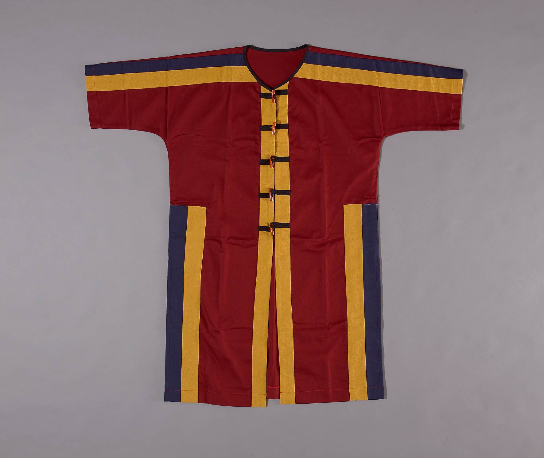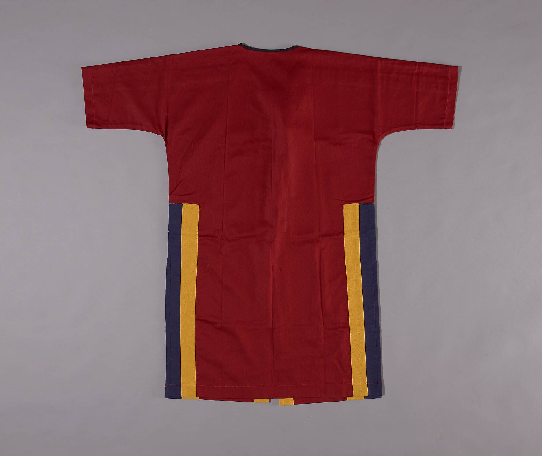 此為一件以紅色布料剪裁縫製而成的對襟圓領短袖長上衣,穿著時,長度及膝。領口以黑布緄邊,兩手臂上方及衣身兩側腋下開岔處貼縫藏青、土金兩色長布條,前襟則貼縫一片土金色布條為飾。另在前襟中上方處縫有五對黑布紐帶,及五顆木質橢圓雙孔紐釦,下方敞開。