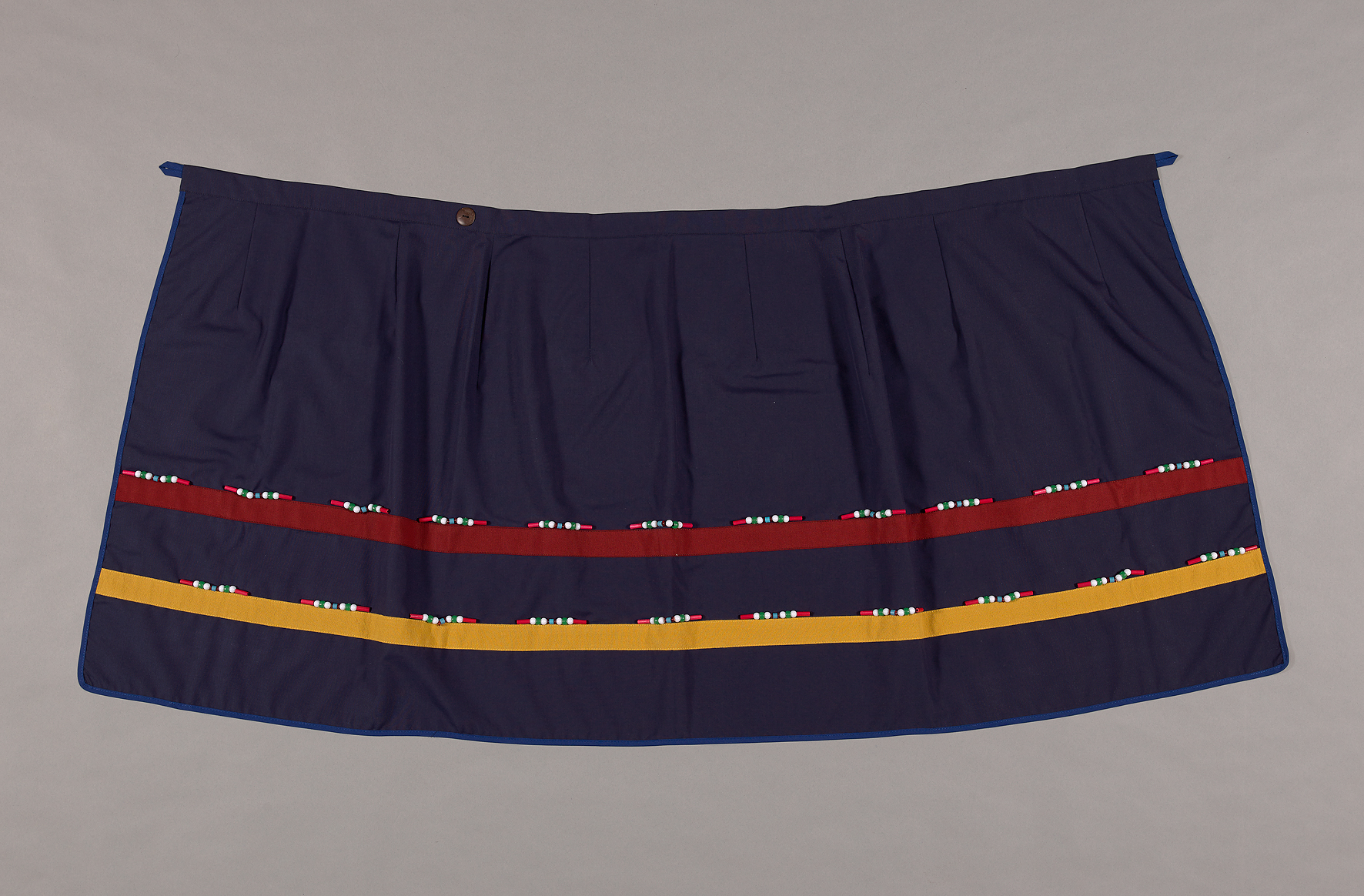 本件女裙係以一片長方形的藏青色化學纖維布料製成,裙子上緣處打上幾個皺摺使其略為縮短寬度成為腰圍,整件布面亦略呈扇形。再於裙子上緣貼縫一條同款之藏青色的長條形布條,兩端縫有藍布套環,以同款藍色布於裙子左、右兩側及下襬處緄邊。裙子正反兩面於腰際處各縫製一顆棕色鈕釦。裙子正面中央下方貼縫長度與裙子寬度相等的暗紅、土金兩色布條,並在布條上方橫向縫綴珠串為飾。