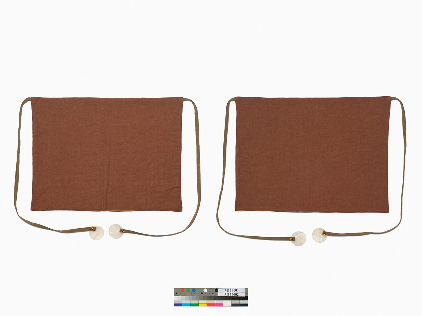 本件係以方形的棕色尼龍布料為底,在中央下方處貼縫長度相等的寬面淺棕色布片,再於整片布面的左、右上方兩角縫接同款色澤的淺棕色綁帶,綁帶尾端各以一片半透明的塑膠圓板作為裝飾,並再綴有紅、黃兩色珠子。護腳布為成對穿著,因此本件與館藏編號M139002為同一組物件。此外,撒奇萊雅族的護腳布另有銅鈴綴飾,分別為館藏編號M139101及M139102。