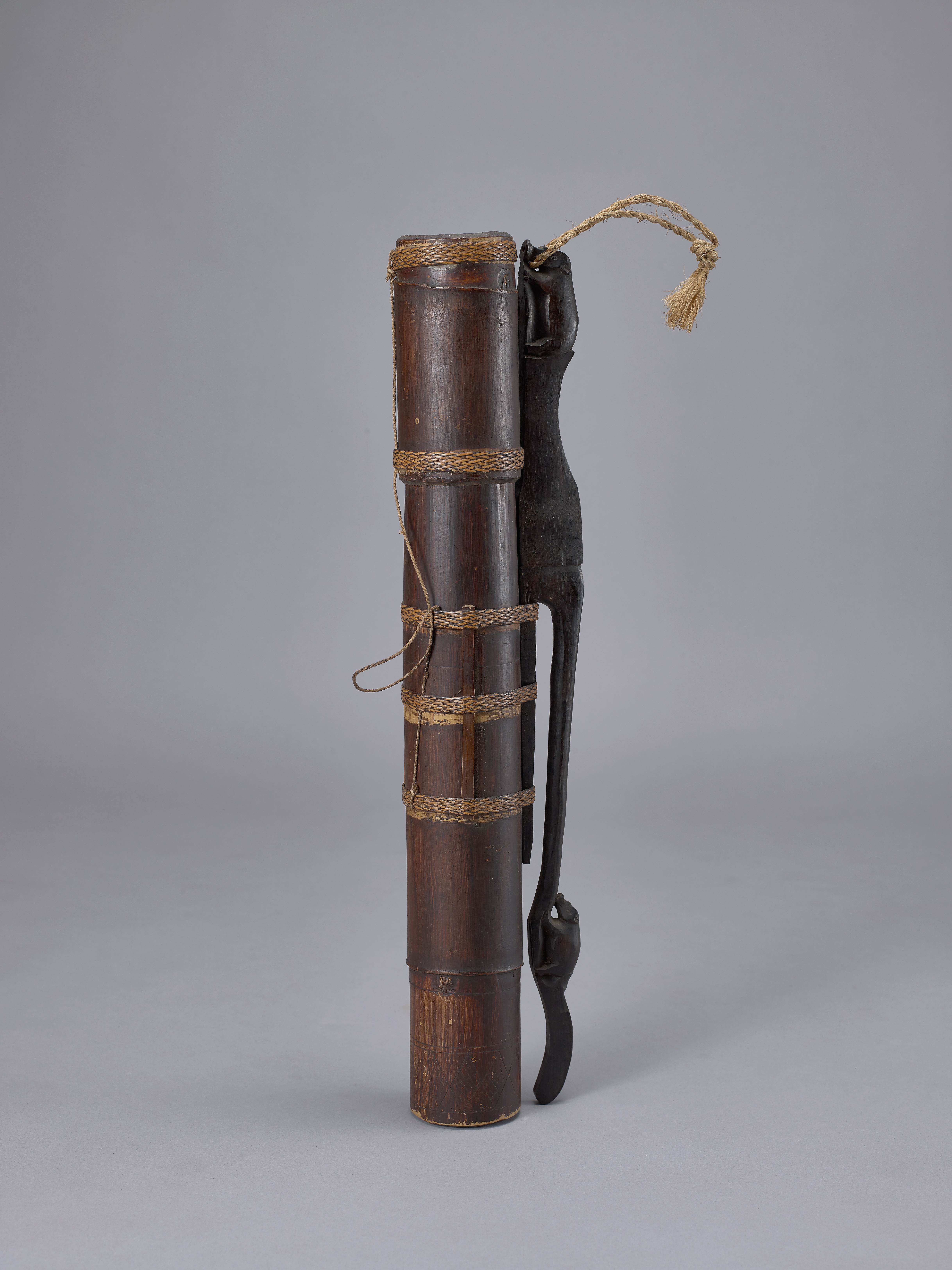 此為一套竹製圓形吹箭筒與吹箭組。箭筒分為筒身及上方筒蓋兩部分。筒身外側塗有棕色漆,筒身下方約四分之一高處刻有菱形紋。筒身側邊另有一個長型分叉樣式的木製把手,前後雕有山豬圖案,上方繫綁一圈粗麻繩環,並以三個細籐圈將其與筒身細綁固定。筒蓋亦纏有兩個細籐圈,將一條麻繩前後兩端分別繫綁於筒蓋及筒身作為提帶,亦可防止筒蓋佚失。此外,箭筒內裝四枝竹籤形制之短箭,箭尾包有紗布及鳥羽。