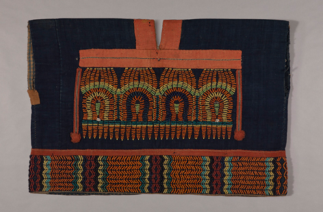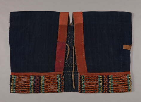 排灣族傳統為階級社會,表現在衣飾文化上,平民服飾通常素面無紋。而頭目及貴族階級則能穿著華服,並飾以代表其身份地位之專屬紋樣圖案或使用琉璃珠,如本件的宇宙之神。宇宙之神族語稱為dagarauskumas,為排灣族傳說中開天闢地創造宇宙萬物之神,亦為排灣族聖山,大武山上的神靈。而本件的珠繡技法亦稱綴珠,製作方式係以細線將數顆穿孔珠子穿綴起來,依照紋樣的輪廓線,每隔數顆珠子之距離打一針,使珠串平鋪於衣服上。本件所縫綴之細珠,樣式貼近傳統琉璃珠,琉璃珠在排灣族傳統社會中,是最具代表的物質文化之一,僅貴族、頭目有資格擁有,彰顯穿戴者的身份地位,細小型琉璃珠通常縫綴於服飾配件上。