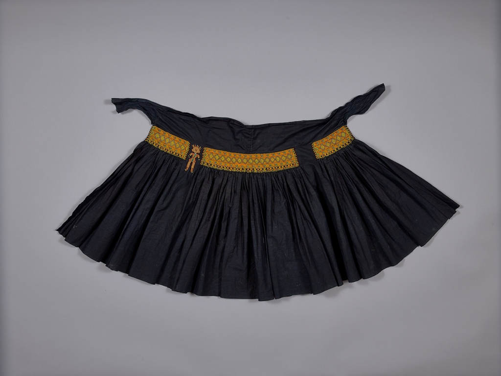 本件係以長方形的黑色布片彼此接縫而製成的單片式男子短裙。裙子上緣打上了若干公分的細皺褶使其縮短而成腰圍,整件短裙成為類似百摺裙的型制。另在裙子上緣接縫黑色棉布腰帶,頭、尾兩端多餘長度作為綁帶之用。在裙身上緣打上細皺褶部分施以綴珠技法,將橙、黃、綠單色細珠縫綴三段橫向相連菱形紋,圖案上下以三角形紋、米字形紋修飾邊緣,左右則為髮狀紋。另在短裙兩處間繫之一縫綴直立人像紋。