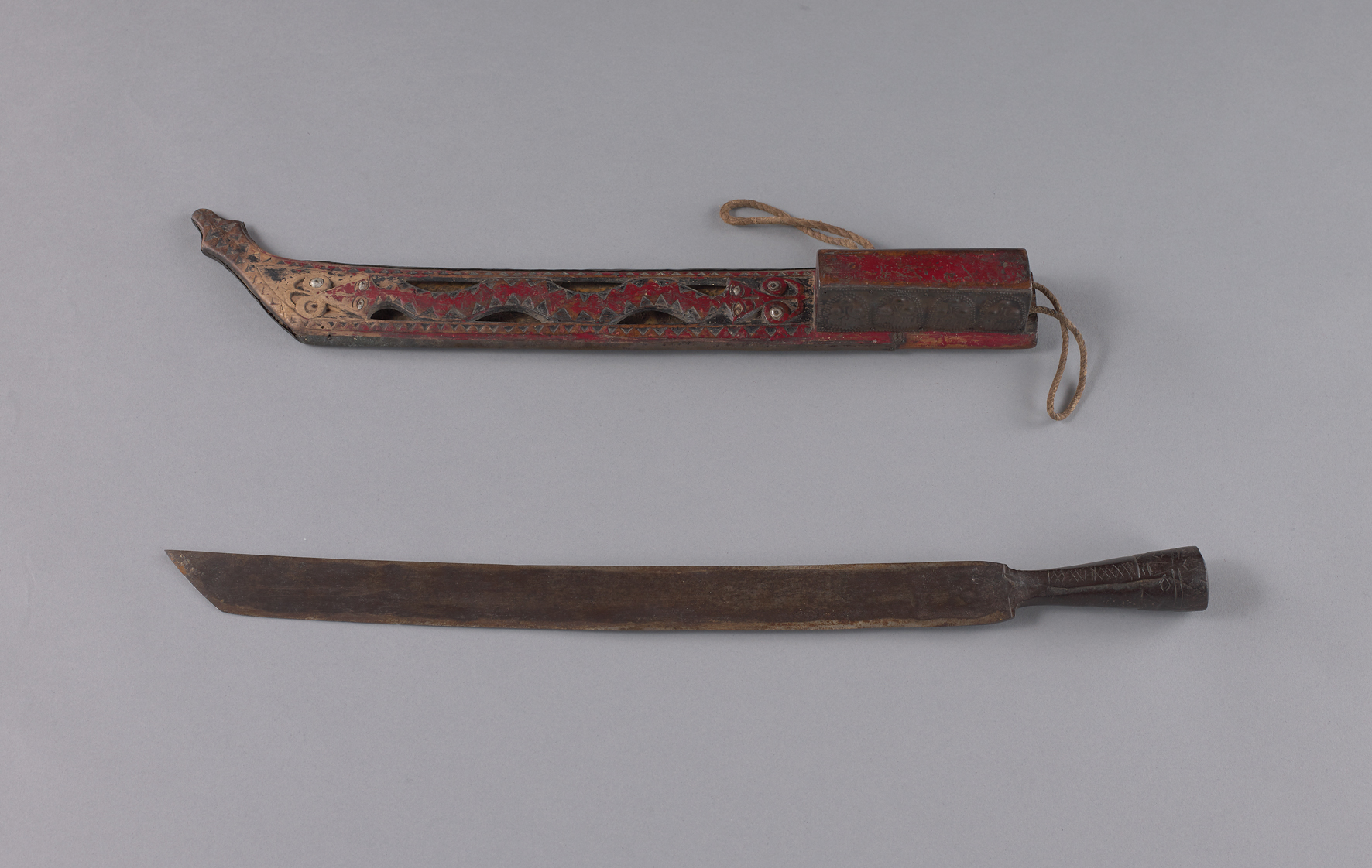 臺灣原住民族的佩刀為男子所專屬,魯凱與排灣兩族雕刻技術精細富美感,從本件刀鞘可見一斑,亦可反映排灣族對於百步蛇的敬仰及祖靈之崇拜。本刀裝飾豐富精緻,顯示使用者可能是身分地位頗高的貴族或頭目階級,同時以風格而言,較接近於南排灣的風格。