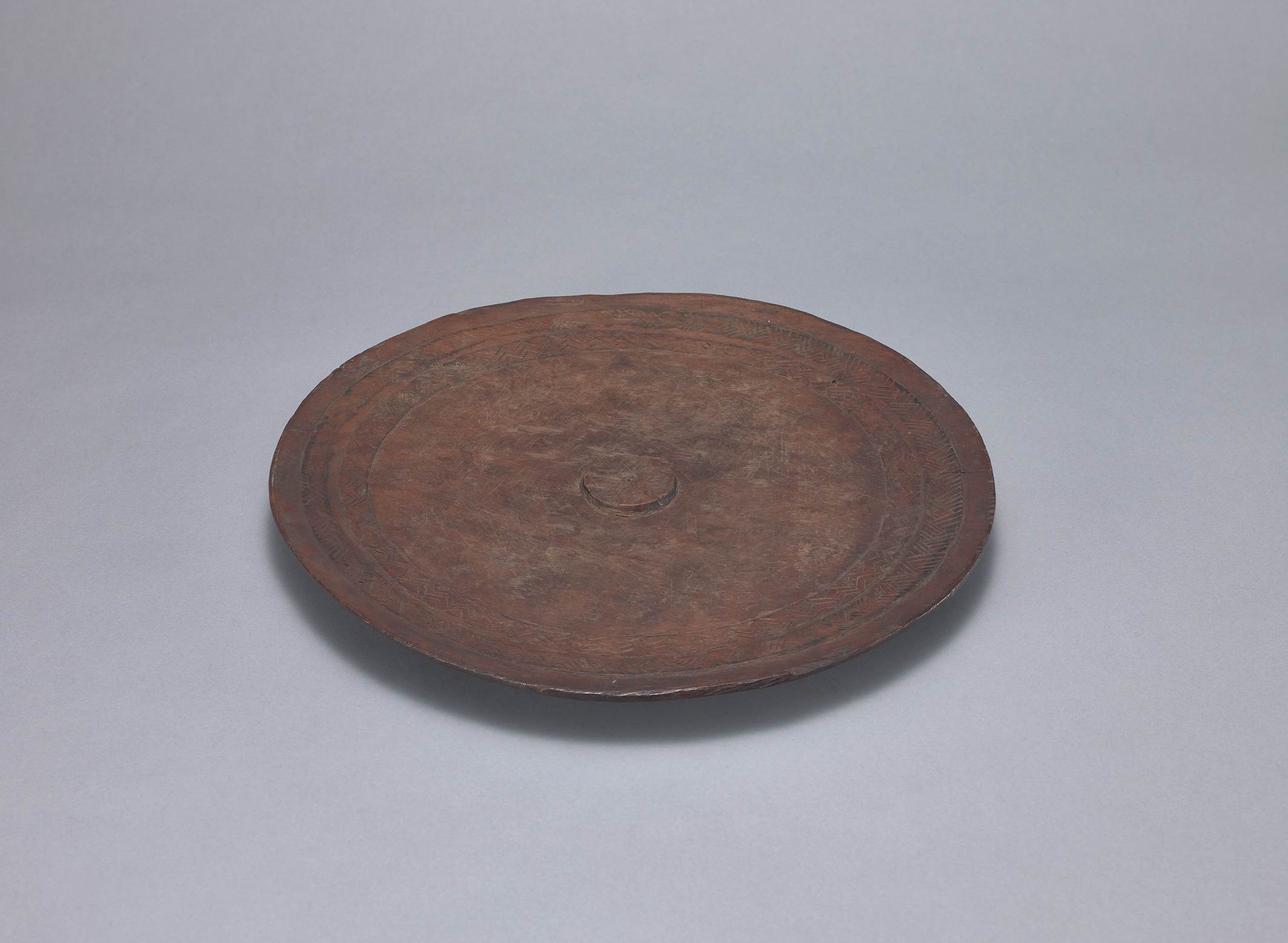 本件以整木刻製成,呈棕褐色,長36cm,高3cm。平底淺腹,週壁外傾,盤面的中央保留有一個突起的圓台供切肉時使用,底部加刻一圈薄圈足。盤面外緣以線雕技法雕以2圈同心圓式線條,之中填佈環繞以連續三角曲折紋和波浪紋。本盤盤面帶明顯的切割刀痕,可能為使用痕跡。