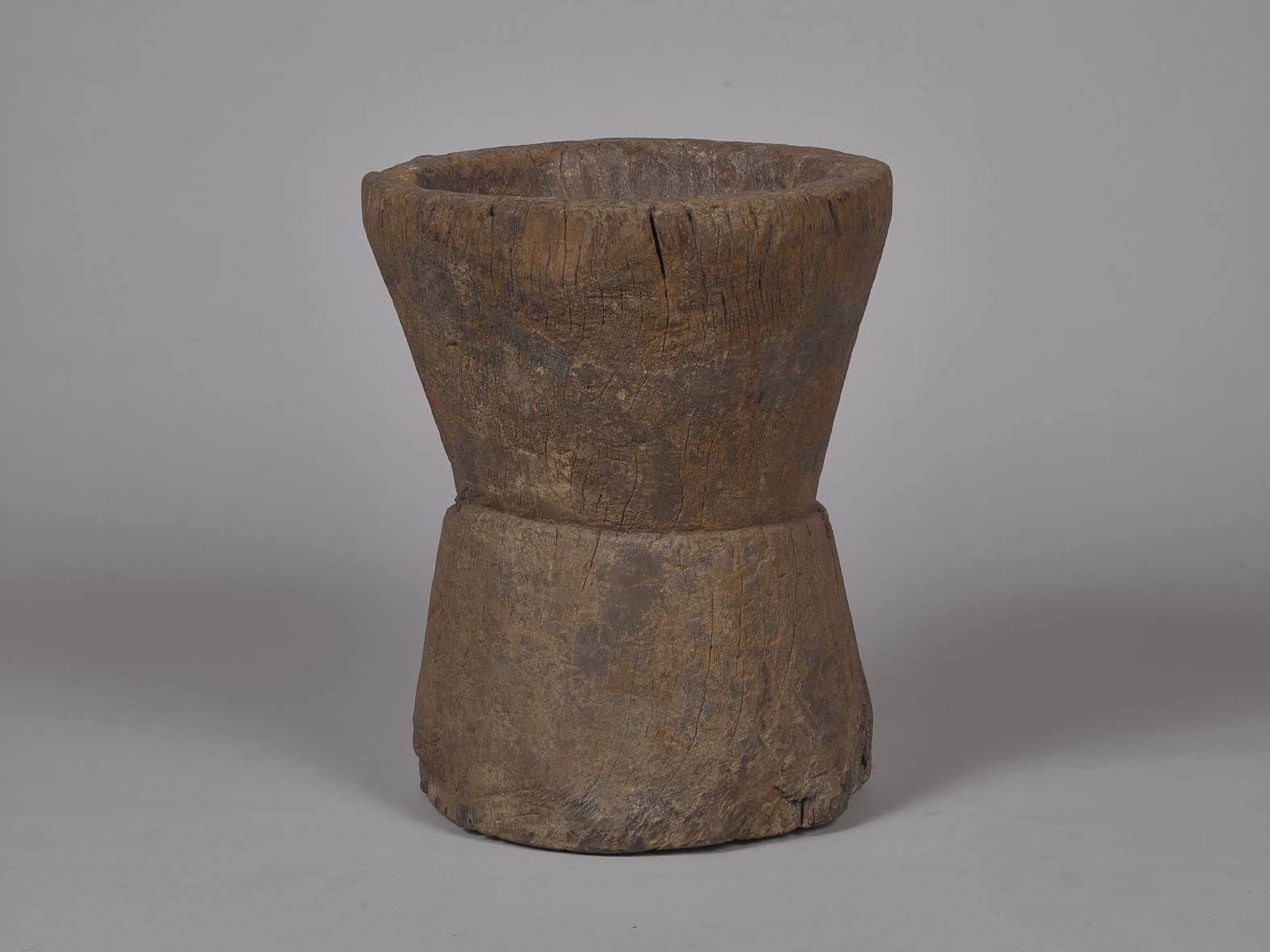 本件是以整塊木頭刳刻成,高49cm。全件可分為臼槽和臼座兩部份,呈沙漏形。木臼作頂面開口,於內部以刳削工法先挖出一直徑較大的淺槽,再於淺槽中央下挖一直徑較小的深槽,臼槽深度約略至臼的腰部。底座與臼槽交界處束腰內削,底部也刳削出一圓形淺槽,不過槽的直徑與深度皆較上方臼槽小。木臼外觀呈現深褐色,由口緣處向腰部延伸有幾道線形裂痕,可能為使用所留下的痕跡,底座下緣的木材也有磨損的痕跡。