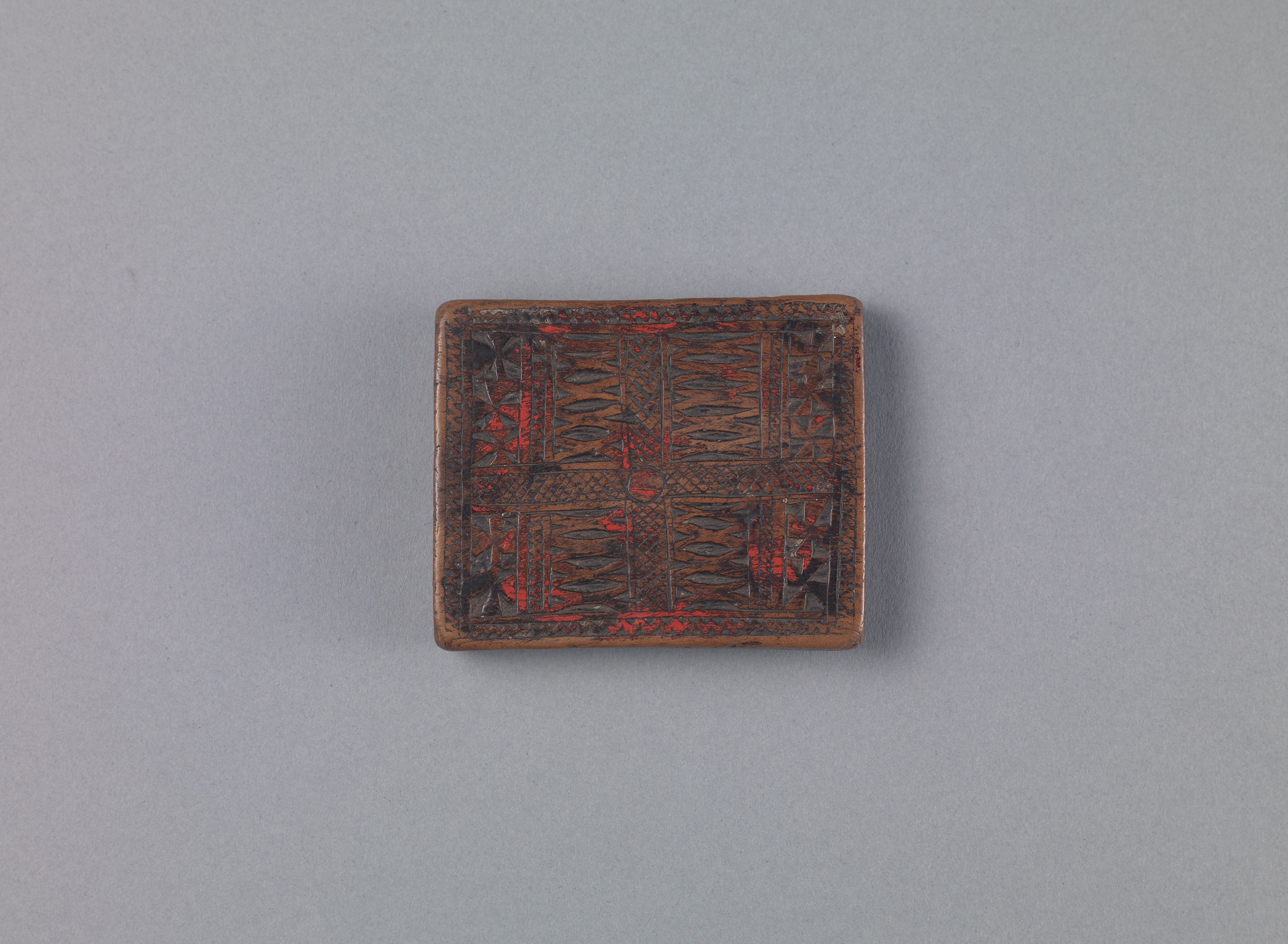 本件以整木雕刻成,長8cm、寬6.5cm、厚1cm。木板呈四方形,無握柄。一面雕滿細密紋樣,在田字形的構圖中,雕有風車紋、直線紋和X形紋,邊框則雕有圓形紋、菱形紋和三角曲折紋等幾何紋樣裝飾,表面可見斑駁的紅漆;另一面無雕飾,表面尚留有蠟及麻絮。