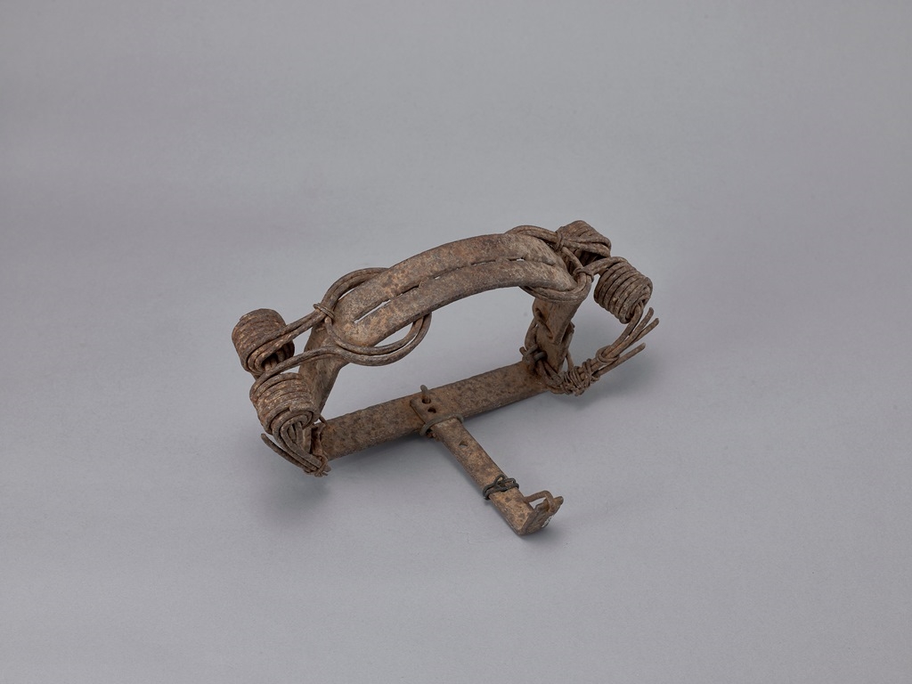 此為一件狩獵用陷機或稱捕獸鋏。全件以鐵製成,包括兩個半圓形且帶有鐵齒之鐵夾,兩側各有一對鐵製彈簧,係以強力彈簧啟動之鐵齒夾之獵具。惟佚失中央之踩踏板。