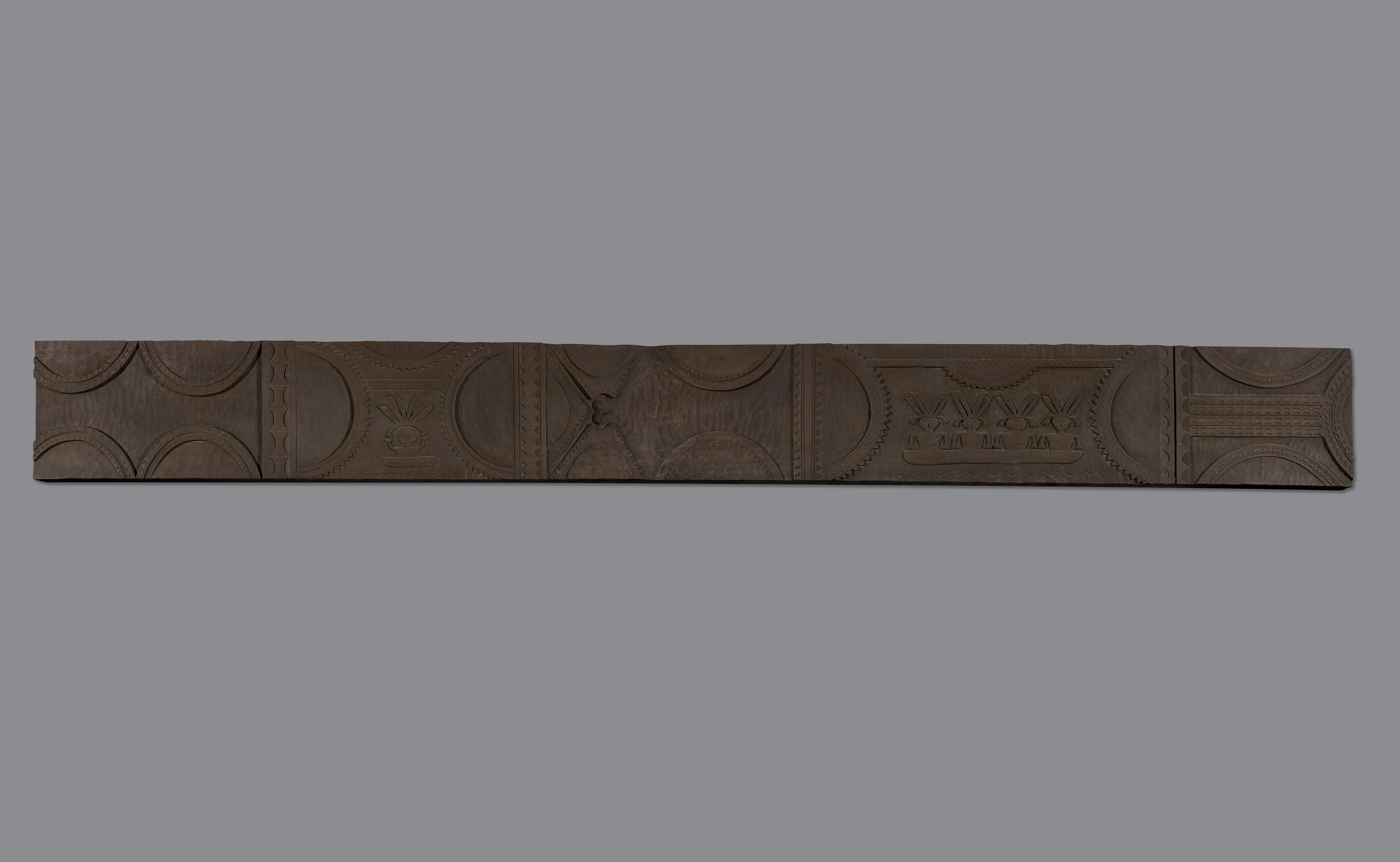 本件木雕由整木雕成,圖紋以橫向排列進行構圖,運用許多半圓紋飾、波浪紋、菱形紋、直條紋等幾何圖紋,人形紋有二組,分別為一名及四名頭戴羽飾的男子乘於木舟上,木舟下方雕有水波紋,中央處有個如海鷗般的紋飾為極簡化的人頭紋。
