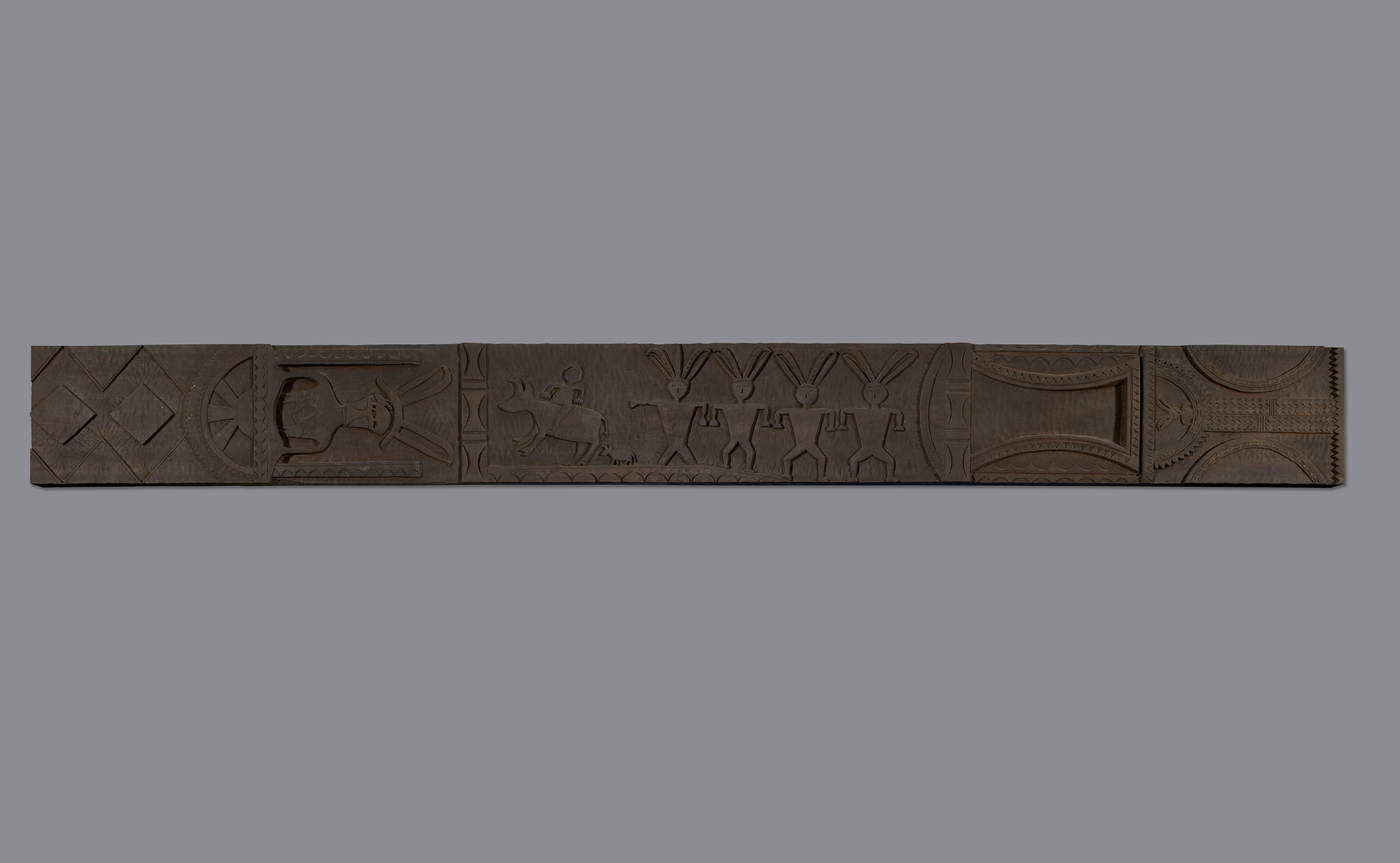 本件木雕由一整根樹木雕刻製成,圖紋以橫向排列進行構圖,運用許多半圓紋飾、波浪紋、菱形紋、直條紋等幾何圖紋及頭戴羽飾的人形紋作構圖變化,其中半身人形紋的額頭及胸前刻有動物圖紋,中央圖像則有四名男子狀似追趕著騎乘動物的男子,右側的小人形紋則由半圓紋飾所包圍。