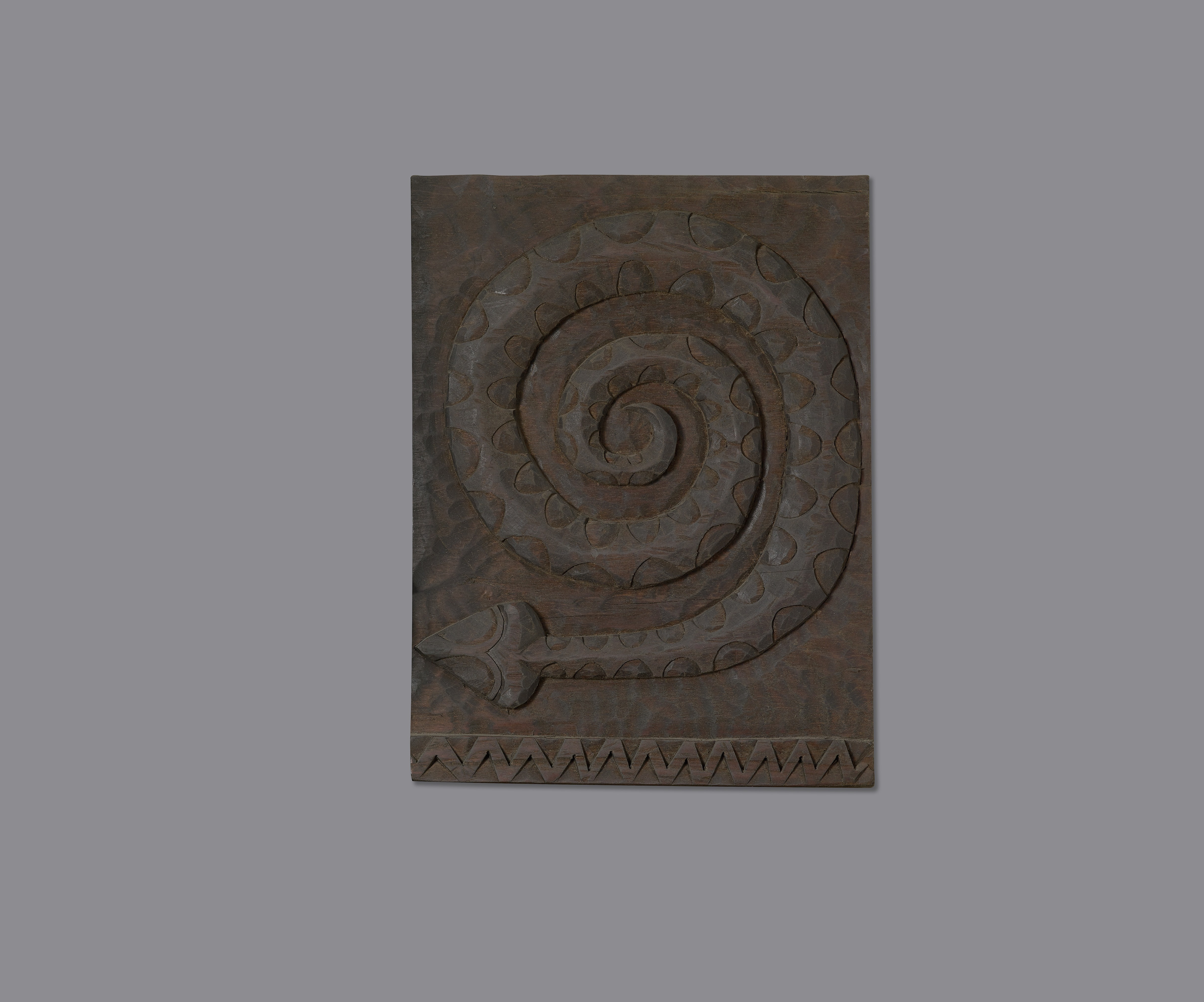此為一件方形木雕,以浮雕技術雕刻一條捲曲之蛇形紋,依其蛇身上之菱形與三角形紋路,推測為百步蛇。下方另雕有曲折形紋及橫線紋。本件木雕為局部,裝飾於順益台灣原住民博物館一樓大廳電梯外。全件木雕另有兩根直立式木雕(館藏編號M093100、M093200)、一面作為門楣之橫向木雕(館藏編號M093000)及門楣左側之M093500,至於本件則是位於門楣之右,本件下方之曲折形紋則與M093000之橫向木雕相連。