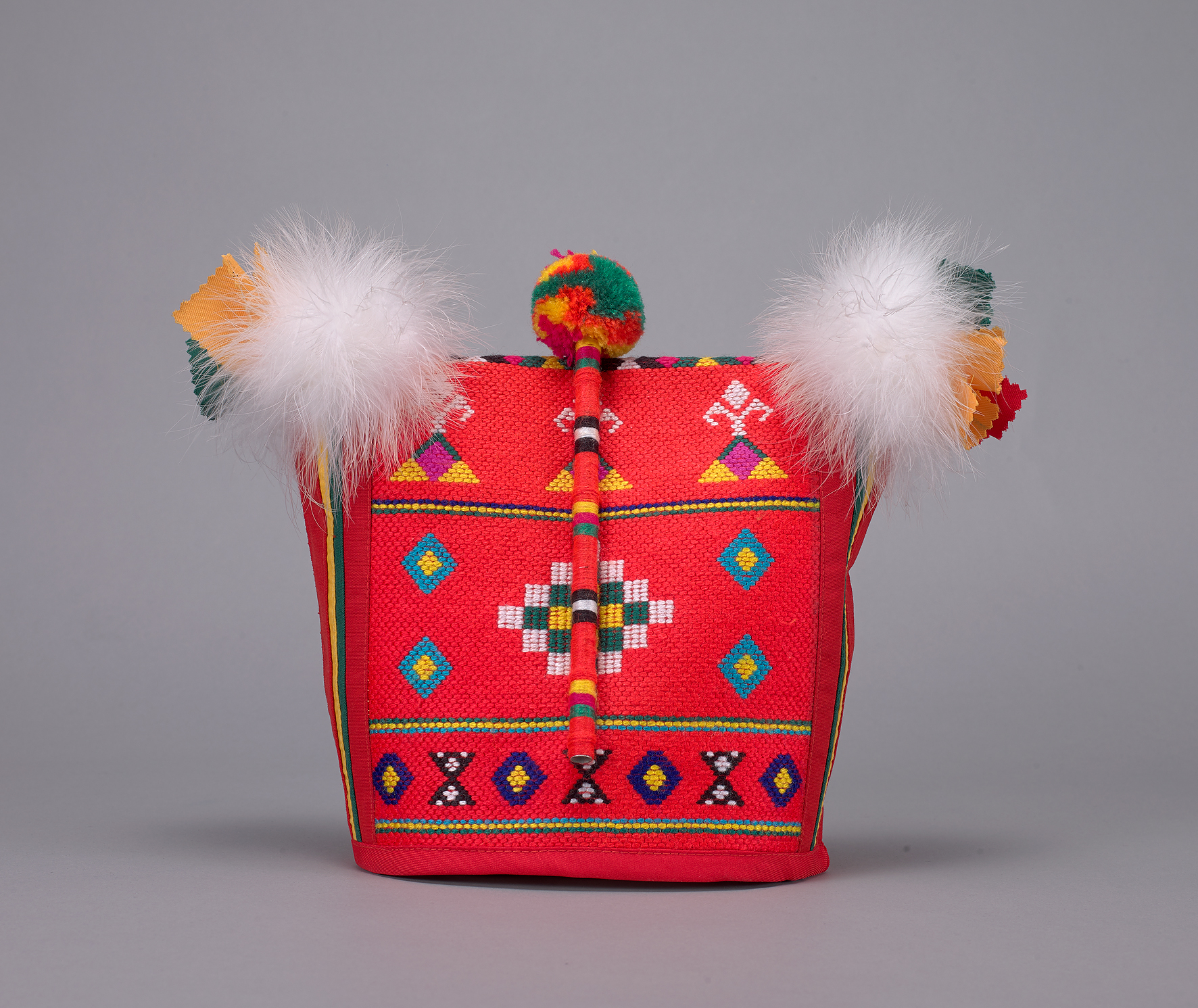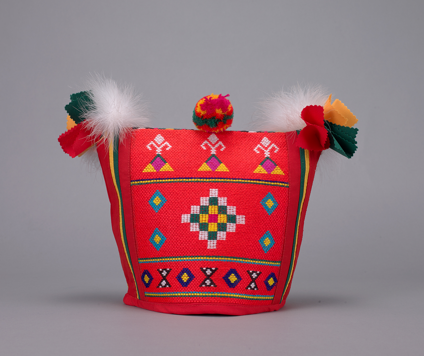 此為一件方帽形制之男子禮帽,係以夾織紅、白、綠、桃紅、黃、藍、淺藍、黑等色毛線的織布為底,帽身正、反兩面織紋圖案相同,有橫條形紋、三角形紋、方形紋、菱形紋、三角形紋等幾何圖案,並以中央由數個方形紋所排列的菱形紋為主要織紋圖案,帽身左、右兩側車縫紅、綠、黃三色布條,下方帽緣以紅色棉布緄邊。帽身左、右上方兩角貼縫同樣紅、黃、綠三色布條裝飾及白色毛球。最後在帽身背面中央貼縫一根纏繞彩色帽線的金屬細桿,上方再綴以毛線絨球為飾。