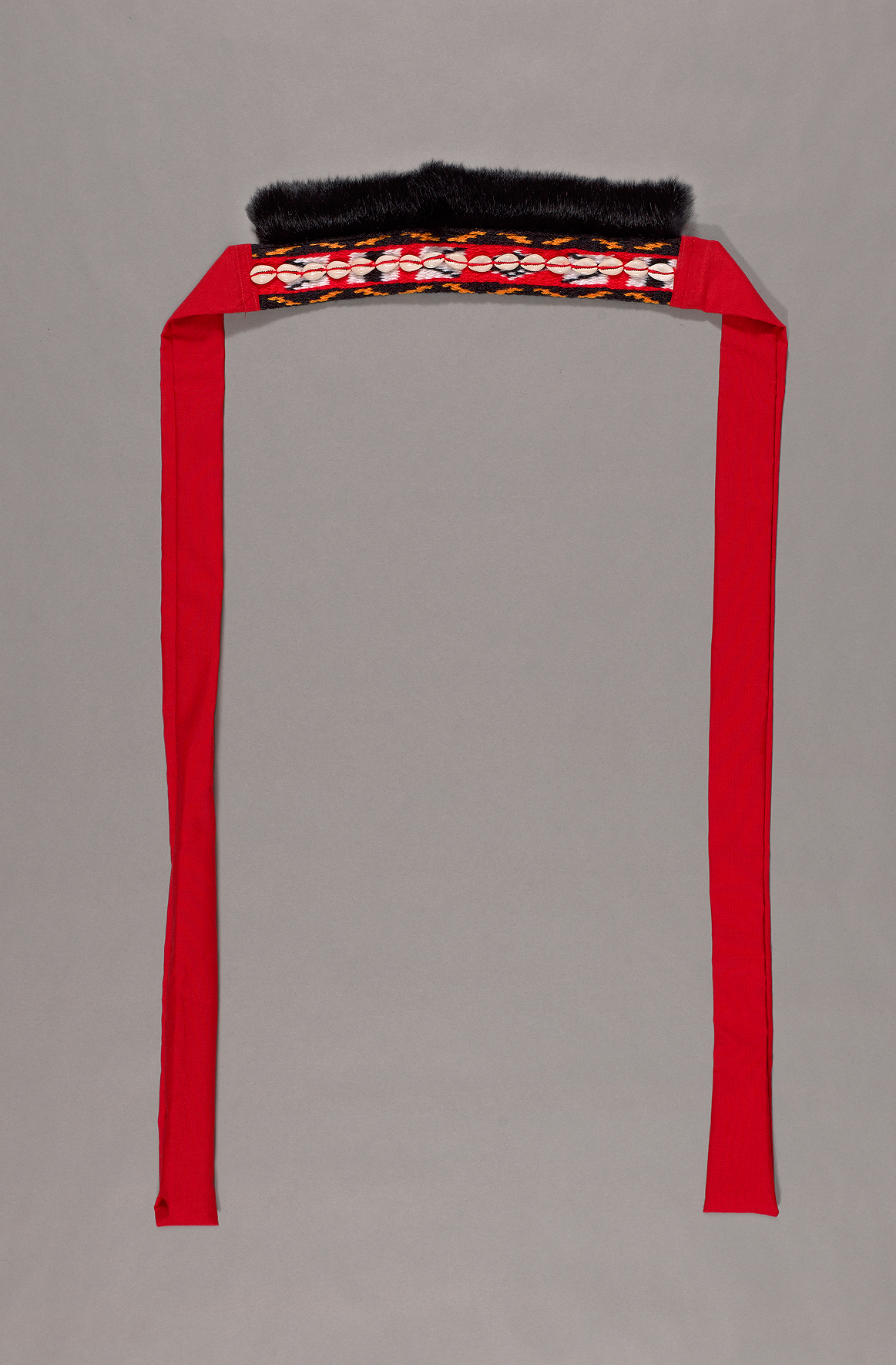 本件額帶係以一條長31.8公分、寬5.8的細長形織帶為主飾。此織帶以紅、橙、黑、白等色線織有斜線形紋、方形紋、菱形紋等圖案,並在中央以紅線橫向縫綴18顆子安貝,上方縫綴黑色獸毛。再將兩條長約70公分左右的紅色長布條於長邊對摺縫合成寬度同樣5.8公分的綁帶,接縫於上述織帶的頭、尾兩端。