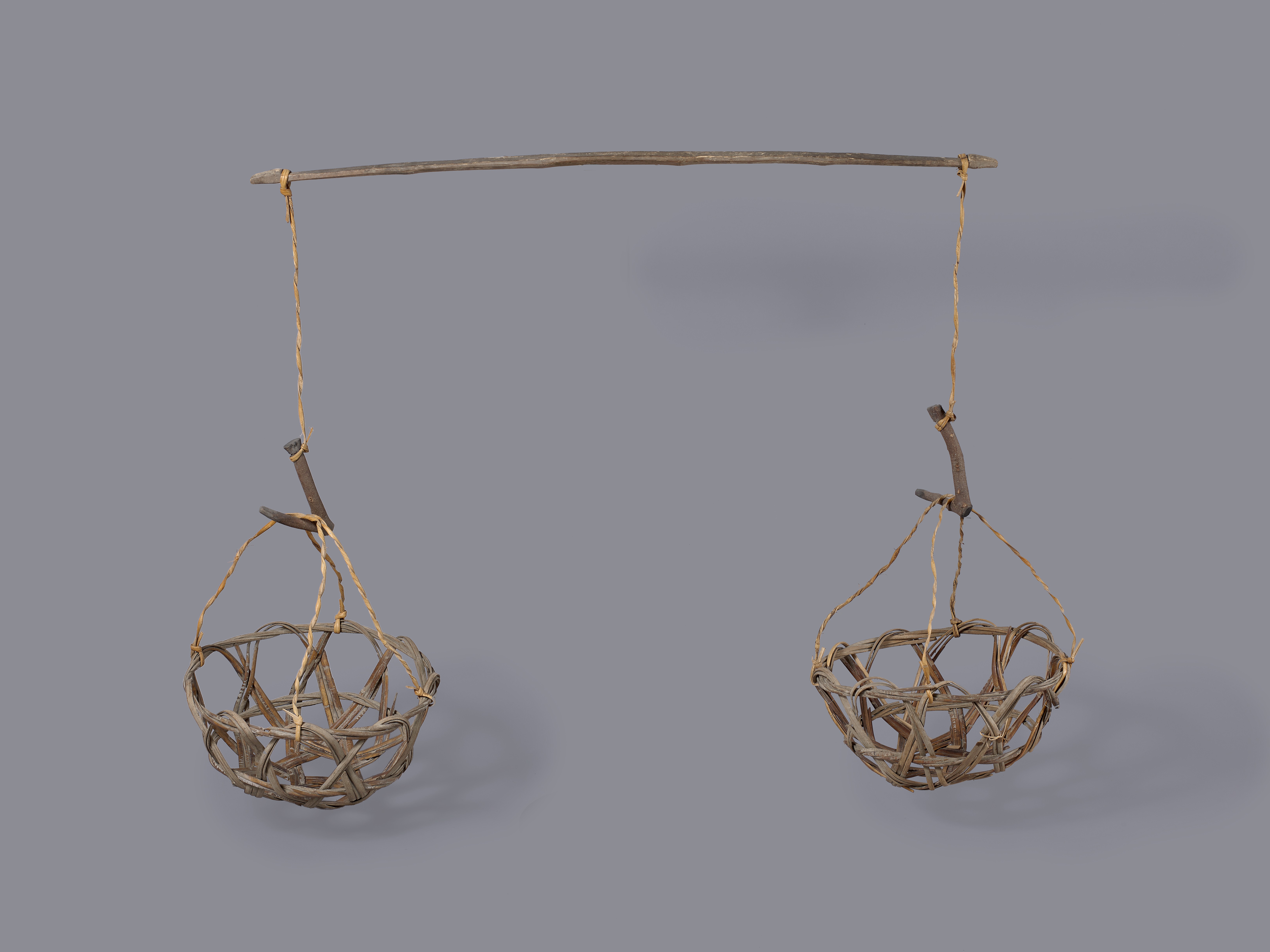 本組挑具由竹、籐、木頭合而成長102.5cm、寬5.5cm。挑擔部分係將竹子剖成長條,竹子中段寬度大於二端,端點略尖帶凹入卡槽,避免繩索滑脫。竹挑擔二端卡槽處綁縛捲曲的籐皮,籐皮的另一端繫以V型木枝做掛勾以勾取承物籃。