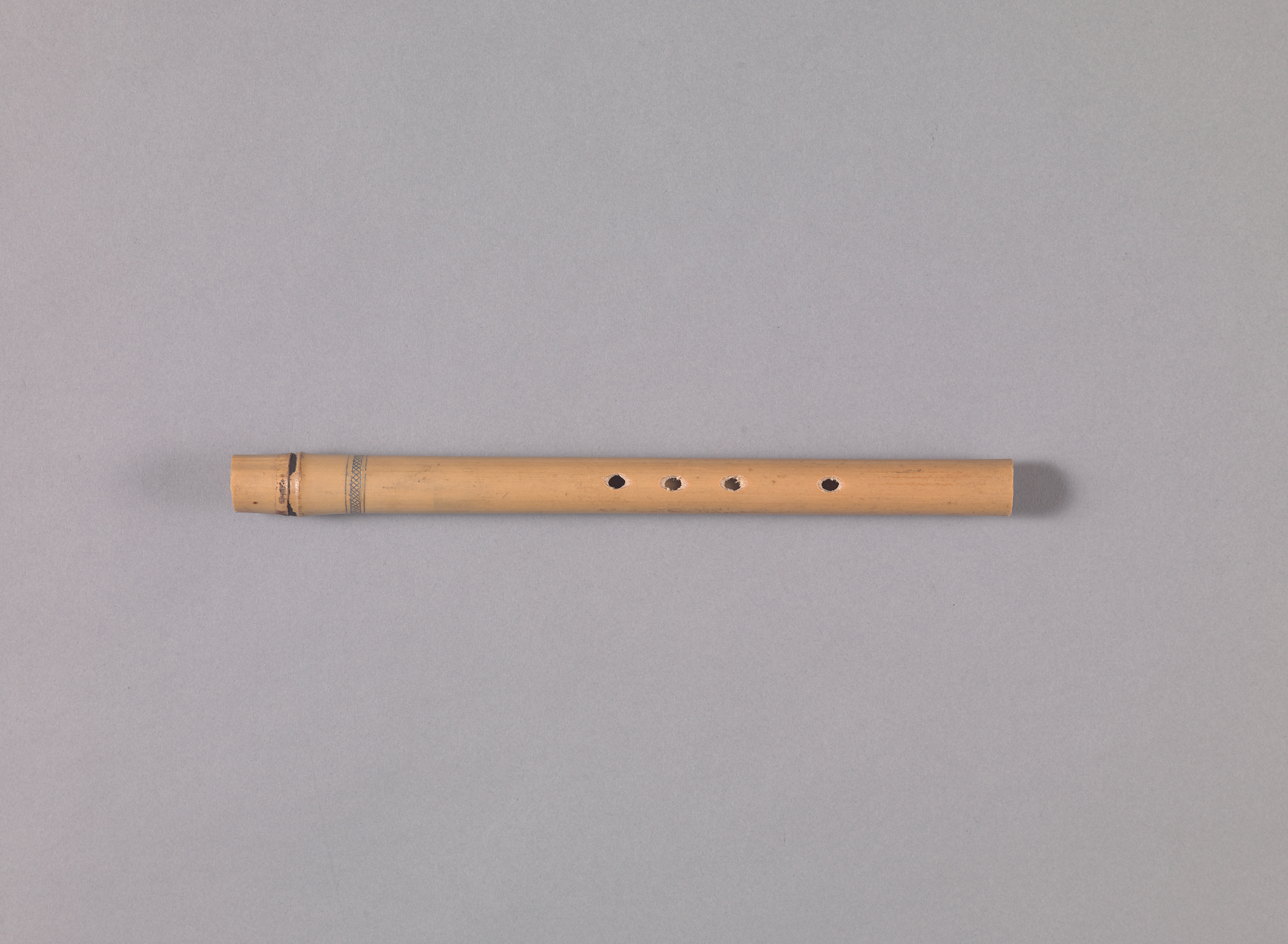 本件獵首笛以一根帶有竹節的桂竹製成,為四孔直笛的樣式。靠近竹節的一端為吹口,竹節下方雕有橫向的藍色相連小菱形紋,笛身中央鑽有四孔,分別為吹奏時左、右兩手食指及中指擺放位置,拇指於笛身後方作為輔助支撐。