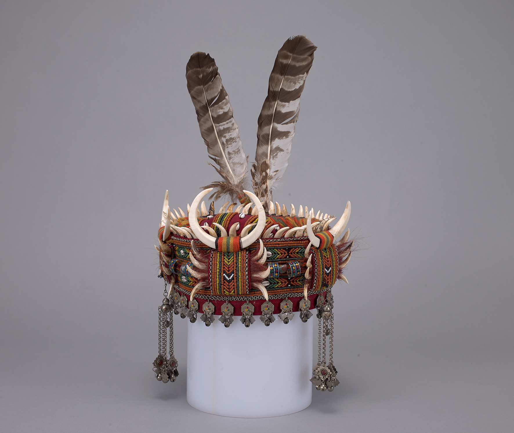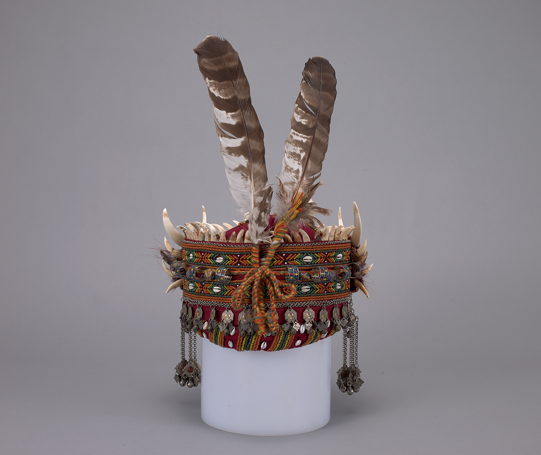 帽飾在臺灣原住民族社會中,除了具有遮陽擋雨及保護頭部之功能外,會以帽飾上的裝飾象徵持有者的財富、地位或是功績。排灣與魯凱兩族因階級社會的關係,表現在衣飾文化中,平民穿著素面服飾,唯有頭目及貴族能穿著華服並施以代表其身份地位之專屬紋樣圖案,例如本件大量使用的琉璃珠及鷹羽。兩族頭飾形制亦相近,如以太陽形紋作為帽徽在男子頭飾中極為常見,女子則多如本件之造型。琉璃珠是排灣族最具代表的物質文化之一,僅貴族、頭目有資格擁有,彰顯穿戴者的身份地位,並且視為傳家或婚聘中不可或缺之寶物。本件因為新製,故使用之琉璃珠多為仿製,其材質如塑膠、陶土等。