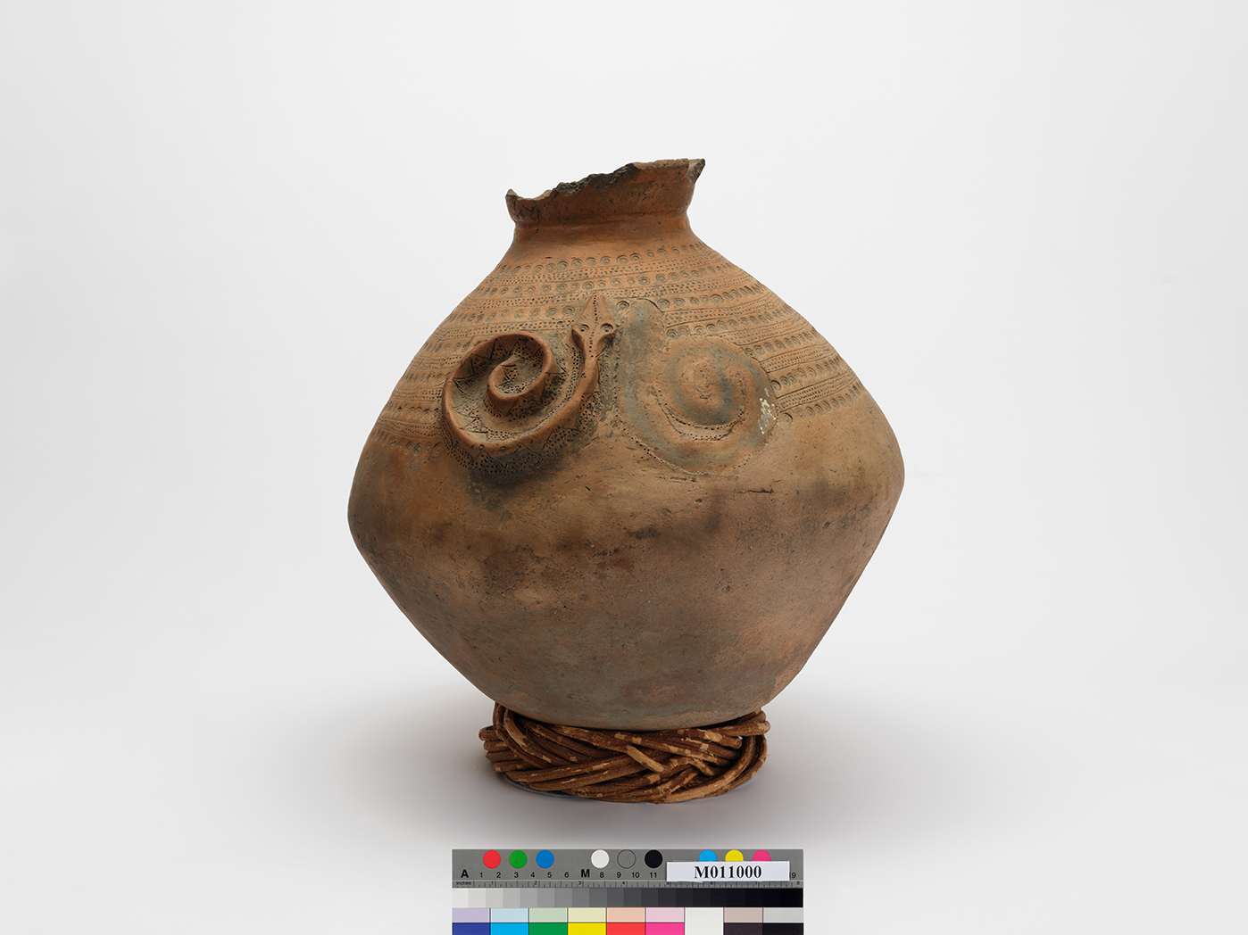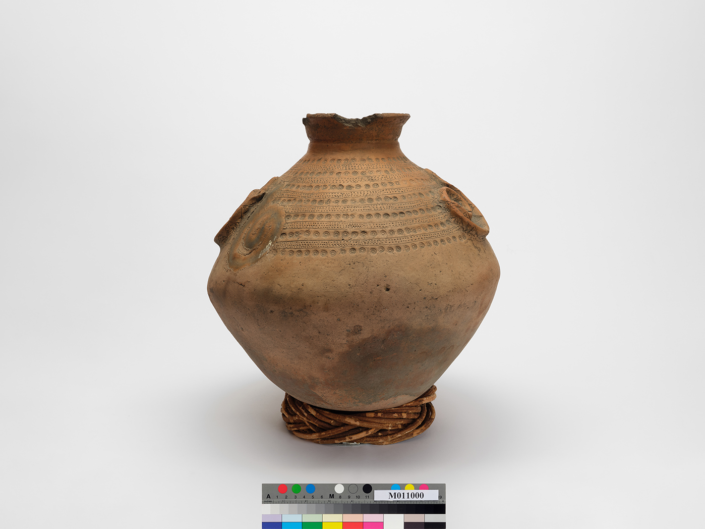 型制特徵:本件文物其形制為短頸、闊身,呈現出上窄下寬的外觀形式。本件文物在壺肩兩側各有一對蛇紋(註:兩側皆各脫落一隻),壺肩上環繞七排螺紋及細點紋圖樣,其餘部分沒有其他紋樣,呈現平滑狀,屬vinalingalavan類型公壺的一種。 風格特色:依據撒古流‧巴瓦瓦隆的分類,本件文物屬vinalingalavan類型的陶壺。vinalingalavan排灣語為「蛇身捲曲」的意思,形狀有如算盤的珠子,成菱形,其紋樣為所有陶壺中最精緻而多樣的一種。此種壺有公壺、母壺和陰陽壺之分,公壺的特徵是壺身上有百步蛇的紋樣,母壺則以太陽紋為主,或者壺身有乳狀隆起,陰陽壺則是公壺與母壺的混合體。 文化意義:排灣族藝術家撒古流‧巴瓦瓦隆將陶壺象徵為「人」。壺似人頭,壺口周圍為頸部,其下則為身體,如同人的形制般的比擬鮮活。每一個陶壺都有不同的紋樣,其所代表的意義也有所不同。撒古流‧巴瓦瓦隆表示reretan(祖靈的居所)是排灣族一句古老的語言,有「寶貝嬰孩」之意。排灣族人對嬰兒有個暱稱叫rereq,指的是還未長牙的新生嬰兒。因此,以reretan來爲陶壺命名有它特別的意義,它是對新生命誕生的渴望及爲民族的興旺和繁衍祈福。reretan象徵民族文化的子宮,祖靈在人間的居所。 在排灣族之祖先來源的許多傳說中,陶壺與祖先的孕育有著極為密切的關係,所以在族人的傳統觀念中,陶壺始終是一神聖的器物,但由於陶壺是一容易破碎的器物,加上排灣族古陶壺的製作技術也已失傳,隨著時間久遠,在搬動時不甚摔破,部落衝突爭戰時造成陶壺的壞損,都是使古陶壺數量減少的因素,這也使得古陶壺更加珍貴。總之,陶壺在排灣族社會中有其神聖與神秘的一面,更有其豐富的文化意義,其有如以下幾點說明: 一、象徵頭目或貴族家世族關係和地位。 二、貴族階級的傳家之寶,尤其是有浮雕狀蛇形紋附著的第一等陶壺,是不能隨意流入別人家的。 三、貴族階級婚嫁時的聘禮。因此由婚嫁所用陶壺散佈的區域,也可探索出貴族間婚姻分佈的情形。 四、視陶壺為祖先的神靈,在祭祀時,是主要的祭祀對象之一,尤其是五年祭時,陶壺便成為歷代祖先回家寄宿之所。 五、收藏珍貴的物品,如專門珍藏穀物種子或琉璃珠的陶壺。但即使是將穀物種子放置古陶壺中,並不是以古陶壺作為容納小米的器物,而是對它有一種超自然力量的期待,以求產量的增加。