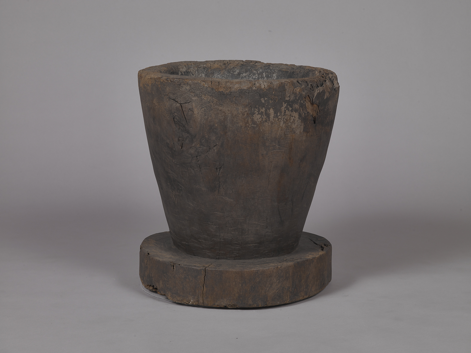 本件藏品係完全使用自然的樹幹刳削而成,圓臼形制,一體成形。形制上,臼身於上方口緣處往下方收腰,底部為一圓盤底座。臼身上無其他雕刻圖案。