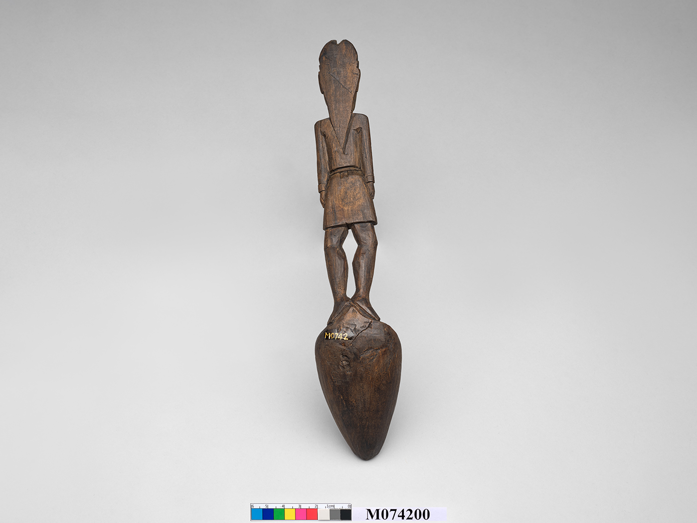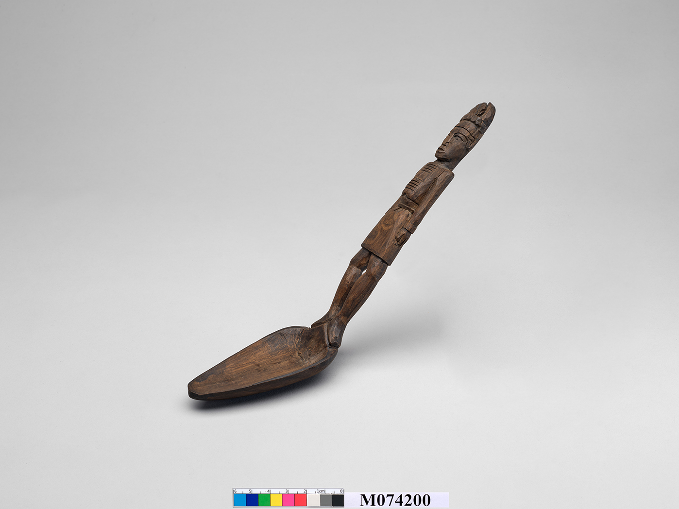本件木匙由木頭刨削製成,椀部與柄部一體成型,椀部呈三角形,前尖後闊,似瓜子形,後端連接之柄部刻有站立人像,平肩,手臂垂放置於身側,雙膝朝外微彎曲,人像頭頂戴有帽飾,著男子長袖短衣短裙,短衣上以數道橫向刻痕代表紐帶盤扣,木匙整體無彩繪,木柄人像左肩開裂,長27.2cm。