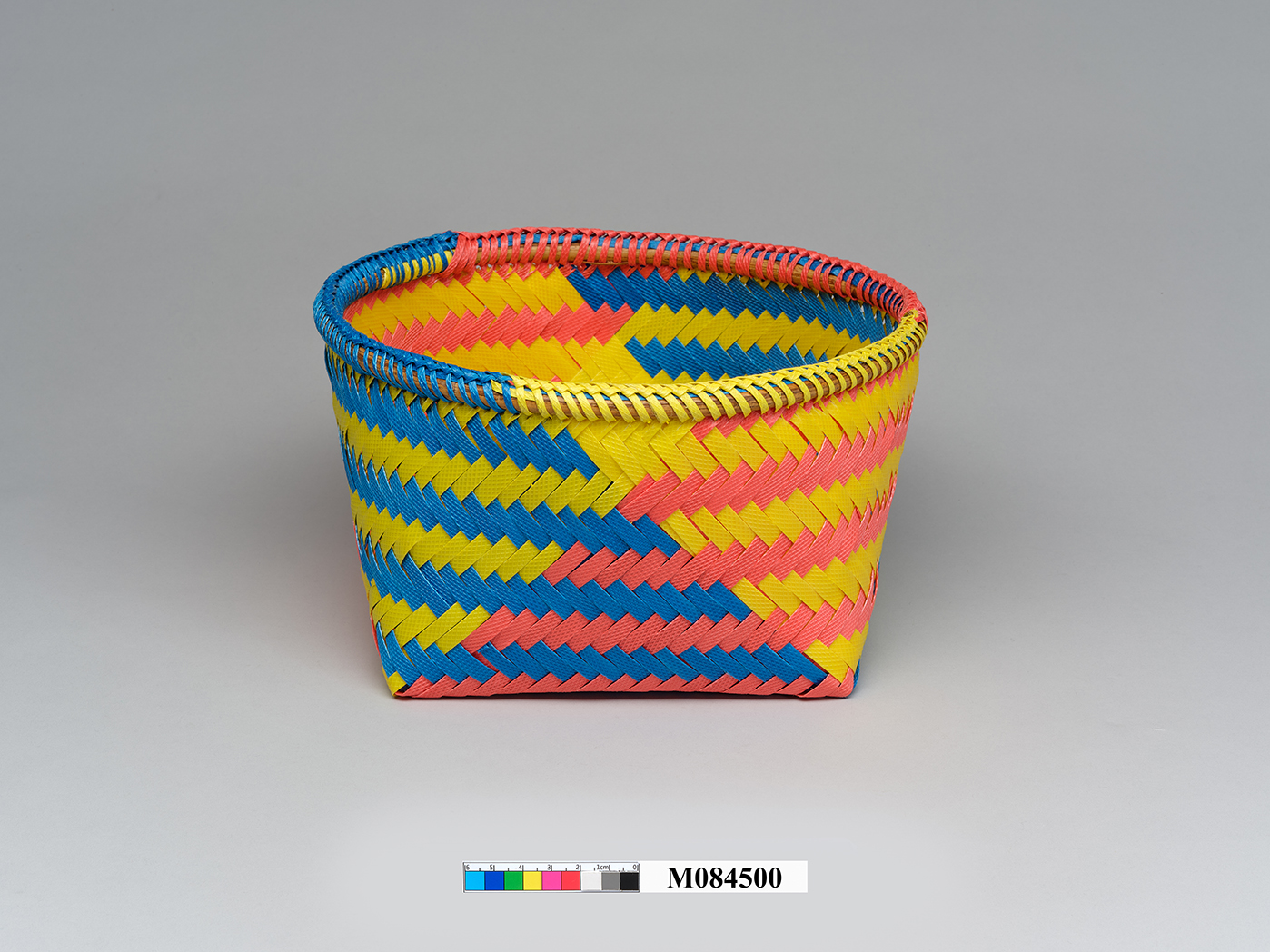臺灣原住民族擅長以竹、籐、月桃、藺草等植物為材,編織各種生活器物,如籃框、背簍、篩子、背籃、儲物容器等。因籐篾可承受較大彎曲且性質堅韌不易折斷,故被大量使用,並且為了因應不同容器,還有多種編織技法,竹與籐的混合使用猶為常見。竹、籐編之技藝,演變至現代,多見以尼龍材質的打包帶代替,打包帶具有多種色彩,故能製造出具有圖案顏色變化的編織容器。因此可知本件製作年代較新,但儘管如此,器身的形制及編織技法仍然延續傳統,從中可見傳統編織技藝的當代延續。
