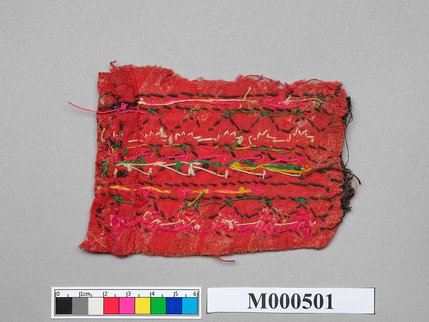 此為一件以紅色布片為底布的貼布繡殘片,此布片四邊有不規則之剪裁痕跡,可能從服飾上剪裁而來或預備製作服飾所使用之繡布。本件紅色布片上貼縫黑色棉布剪裁而成的六個相連人頭形紋及六個幾何形相連半身人像紋,並以桃紅、白、綠、黃等色線繡上人像五官,並採用鎖鏈繡法於人像紋上繡上頸飾。