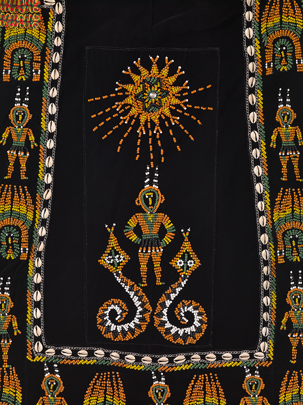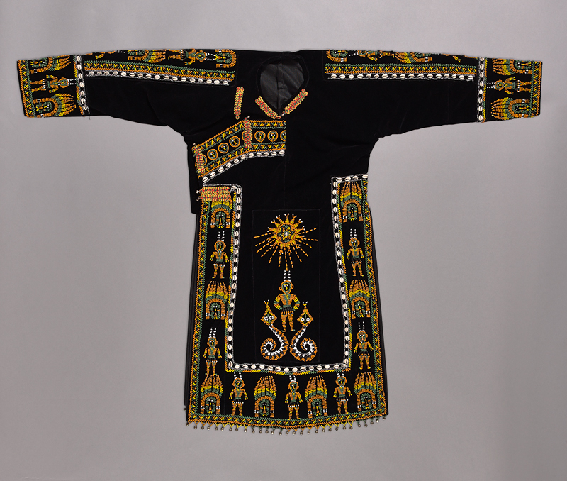 此為一件以黑色絨布剪裁縫製而成的右襟圓領女子長袖連身長衣,形制上受漢人服飾所影響。本件以珠繡作為主要裝飾技法,以橙、黃、綠、黑、白等單色細珠施於兩手臂上方、兩袖口、右襟片、衣身側邊、下襬及衣身正、背兩面中央等處,圖案有戴羽飾直立人像紋、宇宙之神、太陽形紋、百步蛇紋、人頭紋及三角形紋等,並以金屬細鍊和子安貝沿圖案邊緣裝飾之。另在下襬縫綴一排珠串鈴鐺綴飾。領口、右襟片及右腋下處縫有五對蜈蚣狀編繩紐帶及金屬鈕釦。