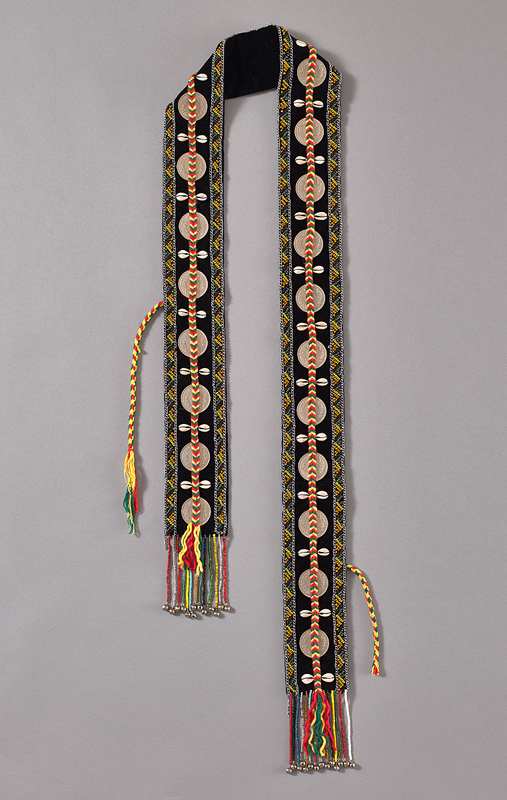 此為排灣貴族服飾配件,稱為肩帶或肩飾,係由一條長條形的黑色絨布片為主體,在正面上、下兩緣縫綴珠串流蘇,色彩有紅、黃、綠、藍、白、黑、橘等色,並以小銅鈴為墜飾。肩帶兩側邊以橙、黃、綠、黑等色珠及細鎖鏈作為裝飾,正中央縫綴20餘顆明治時期1圓銀幣,每顆銀幣以兩個子安貝做區隔,再以紅、黃、綠三色毛線編繩縫綴其上,兩端將未編織完的線材製成流蘇。另在肩帶背面加縫兩條同款毛線編成作為綁帶。
