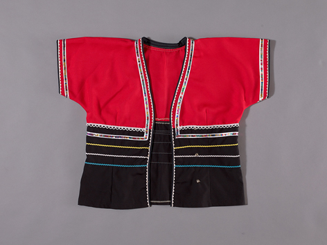 阿美族分布地廣,服飾差異甚大。本件為花蓮地區阿美族女子所穿著之上衣,早期無釦且縫有綁繩。整件服飾多處使用貼縫曲折形紋布條及亮片等裝飾,此為花蓮地區阿美族服飾常用之裝飾技法,常見於上衣、女裙、胸兜、男子後敞褲及攜物袋等。花蓮阿美族女子服飾早期以黑色為主,因日治時期的觀光表演需求而轉為紅色,黑色服飾現今常為巫師(祭師)與長者穿著。