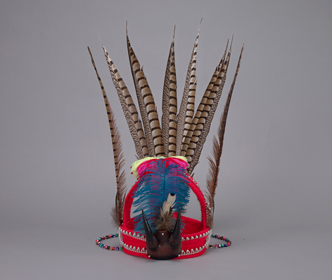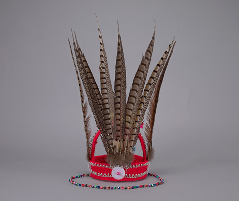 本件帽冠係以紅色毛線編織包覆骨架並貼縫白色珠串裝飾,形制上為一件圓形頭環另以兩條圓弧狀骨架交叉連於頭環前後左右四處,上方有毛線裝飾,但本件並無實質保護頭部遮陽避雨之功能。頭環正前方及左、右兩側綴有白色圓形塑膠片,背面為山羌角,另以扇形和垂直方式插上數根雉雞羽毛等鳥羽。頭環兩側下方則有一條長度較長之彩珠帽帶。