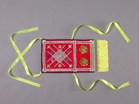 此為一片縱長形的紅色布片製成之胸兜。上緣及左、右兩側邊以黑布緄邊,下襬縫有黃色線條流蘇,左、右上方兩角及兩側邊各縫有一條黃色緞帶綁帶。胸兜正面處以白色曲折形紋布條及串縫的塑膠亮片貼縫方形及長方框形,框內側貼縫大量的塑膠亮片、塑膠星星、銀色緞帶裝飾以及拼接的花朵形圖案等等。