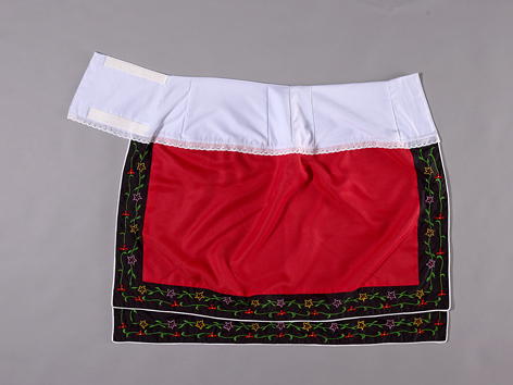 此女子外裙係由紅、黑兩色布料剪裁縫製並接縫一條白色布片腰帶而成。製作方式係先將長短兩片方形黑色布片交疊,上方布片貼縫一片紅色方形布片,後方布片露處後下襬若干公分。兩布邊緣以白色布條緄邊,往內側若干公分繡上紅、黃、綠、白、紫等色花葉、藤蔓形圖案。裙子上緣交疊處接縫一條白色布條作為腰帶,接縫處貼縫一條白色蕾絲緞帶,腰帶頭、尾兩端縫有魔鬼氈。