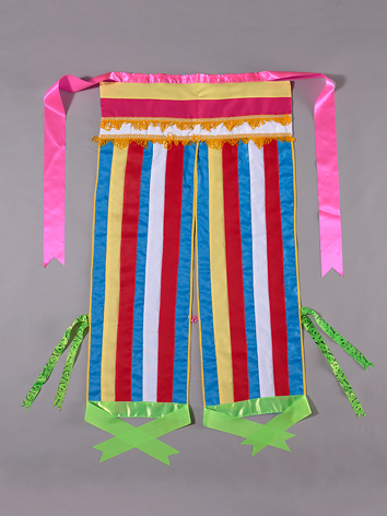 此件後敞褲為男子穿著,係以兩片長方形的彩色布條貼縫褲片製成。此兩褲片以藍布為底,縱向貼縫紅、白、藍、黃色布條。兩側以黃布緄邊,上方交疊若干公分接縫於一條橫向貼縫紅、黃、白三色布條之褲頭,褲頭縫有兩排黃線流蘇,此流蘇有時以毛線或緞帶替代。褲頭上方接縫桃紅色緞帶作為綁帶,褲片於膝下及腳踝處亦縫有綠色綁帶。